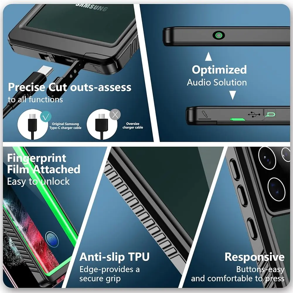 The SPIDERCASE Designed for Samsung Galaxy S22 Ultra offers robust protection with its heavy-duty, shockproof design, tailored to safeguard your device in any environment. This case features a built-in screen protector, offering full-screen coverage while keeping your display scratch-free. Its IP68 waterproof rating ensures your Galaxy S22 Ultra remains protected from water, making it ideal for underwater activities and outdoor adventures.