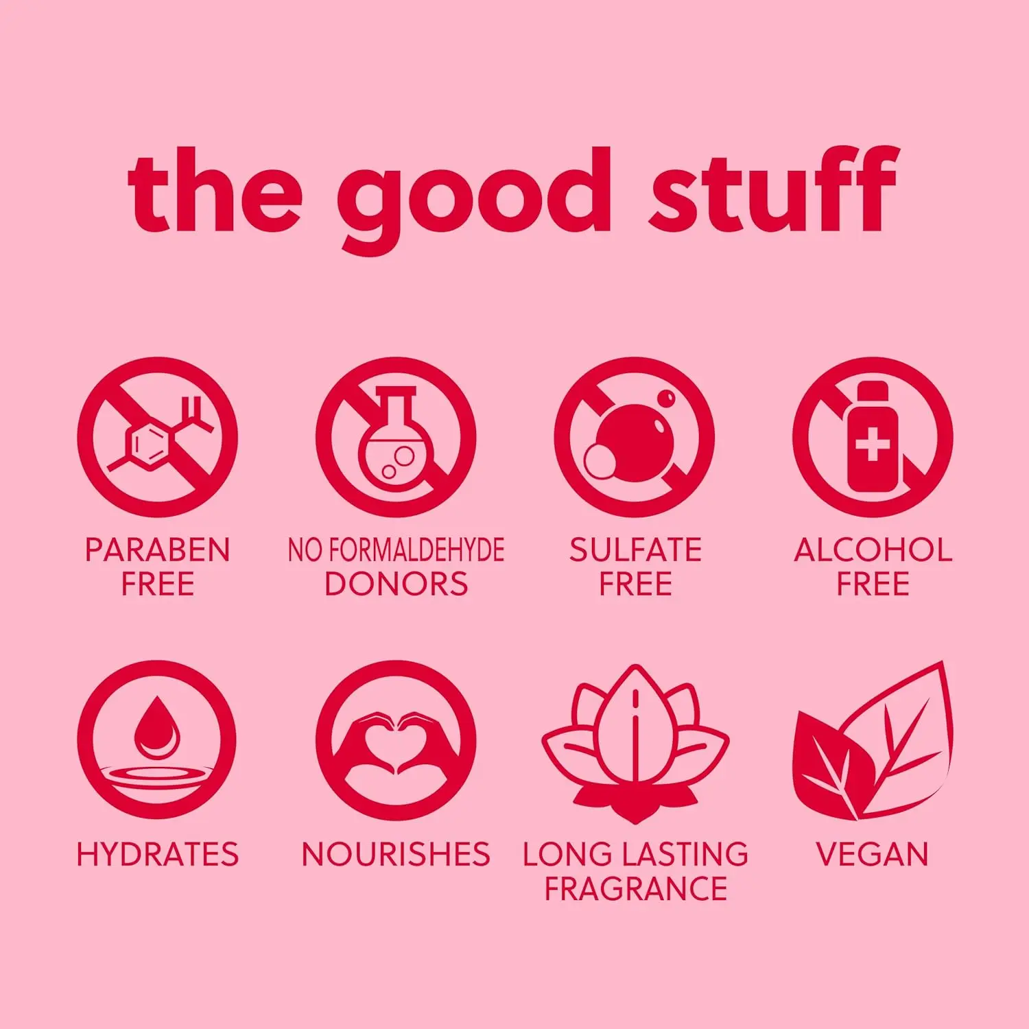 This daily wash has a luxurious foaming formula that cleanses and softens without drying out the skin. It nourishes and hydrates, leaving skin soft, smooth, and glowing.Vegan and free from parabens, sulfates, alcohol, and formaldehyde donors, it features a delightful scent inspired by summer, with notes of fresh strawberry, pink pineapple, and peach blossom.