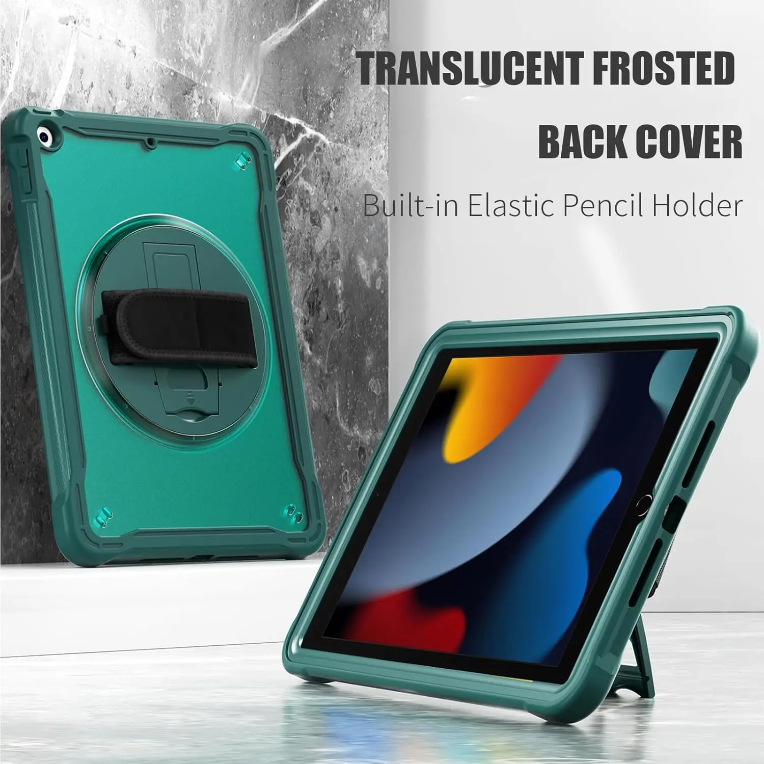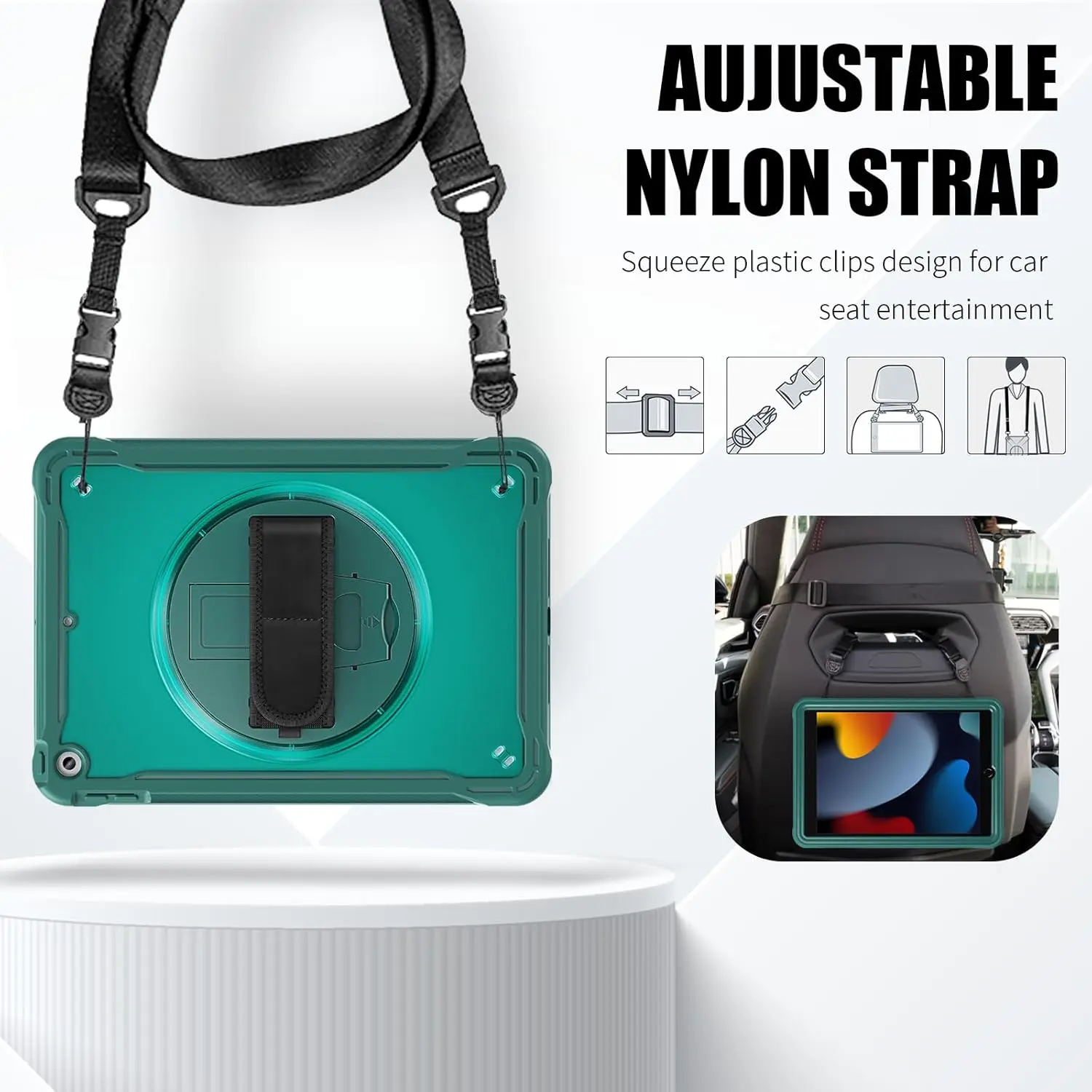 ZenRich Rugged Shockproof Case for iPad 9th/8th/7th Generation 10.2 inch (2021), with Pencil Holder, Rotating Hand Strap, Stand, Shoulder Strap, and Screen Protector (B-Midnight Green)