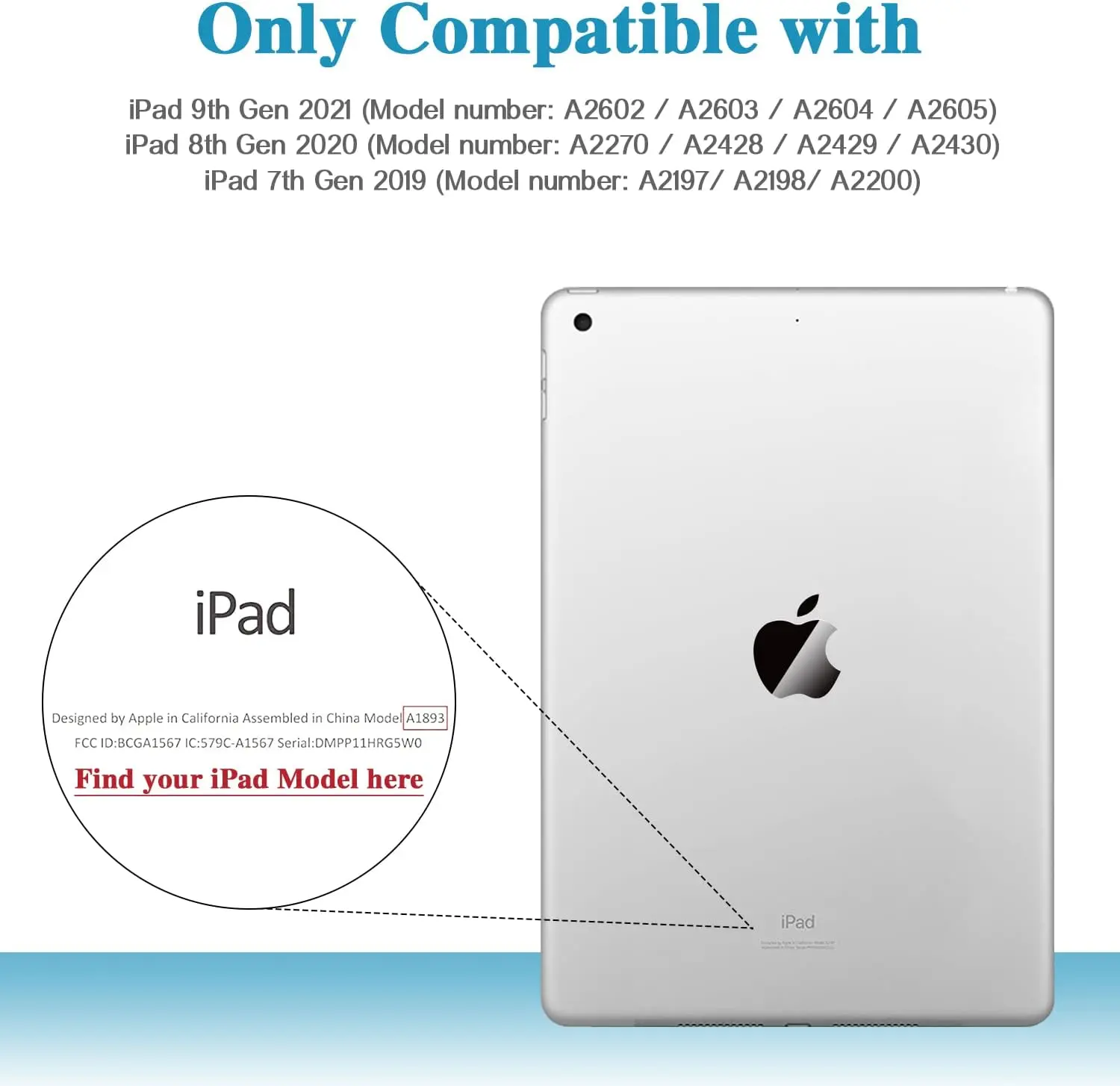 Compatible Devices: iPad 9th Generation (2021) - Models: A2602, A2603, A2604, A2605; iPad 8th Generation (2020) - Models: A2270, A2428, A2429, A2430; iPad 7th Generation (2019) - Models: A219, A2198, A2200