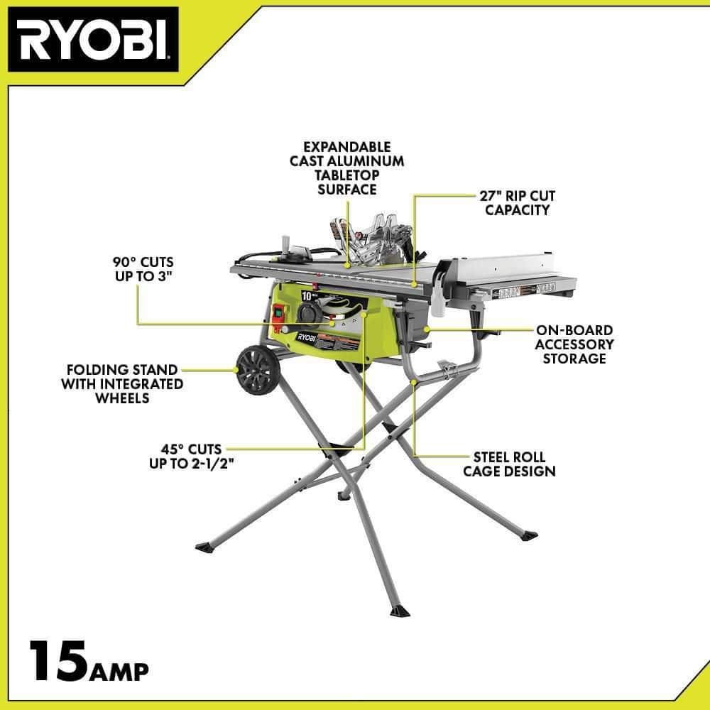 The RYOBI is built for tough tasks with a powerful 15 Amp motor and 5,000 RPM. It features a durable cast aluminum table top, integrated accessory storage, and a folding stand with wheels for easy portability. The saw comes with a 10 in. blade, push stick, miter gauge, rip fence, guarding assembly, anti-kickback pawls, and an operator’s manual. Backed by a 3-Year Manufacturer’s Warranty, it includes the folding stand and mounting hardware.