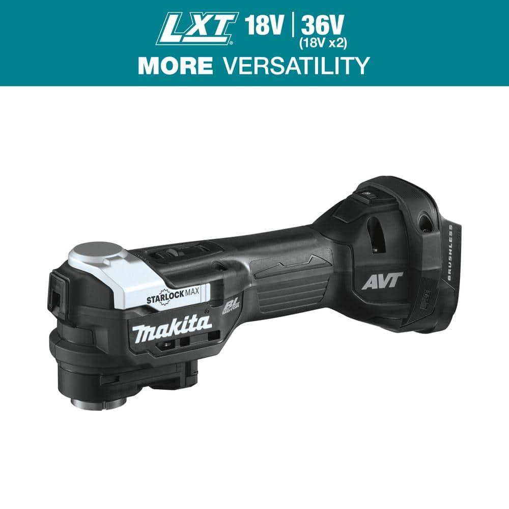 The Makita 18V LXT Sub-Compact Brushless Multi-Tool (XMT04ZB, tool only) provides corded performance without the cord, making it ideal for remodelers, carpenters, and contractors. It features a variable speed dial (10,000 - 20,000 OPM) with soft-start, Anti-Vibration Technology (AVT) for reduced vibration, and a 3.6-degree oscillation angle for aggressive cutting and sanding. Its small diameter grip and large on/off switch enhance handling and convenience. The tool includes the StarlockMax System for quick accessory changes and is part of Makita’s extensive 18V LXT cordless tool lineup.