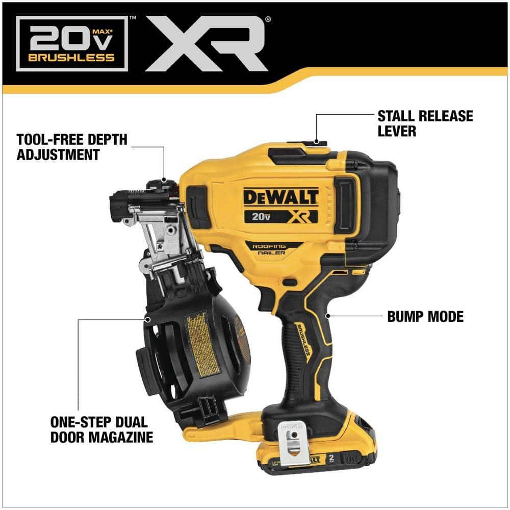The DEWALT 20-Volt MAX 15° Cordless Coil Roofing Nailer offers the ultimate in cordless convenience, perfect for service repairs and small projects. It operates entirely on battery power, eliminating the need for hoses, compressors, or gas cartridges, allowing professionals to start work immediately. This nailer can drive roofing fasteners ranging from 3/4 in. to 1-3/4 in. and features bump actuation mode and tool-free depth adjustment for fast, efficient, and precise nail placement.