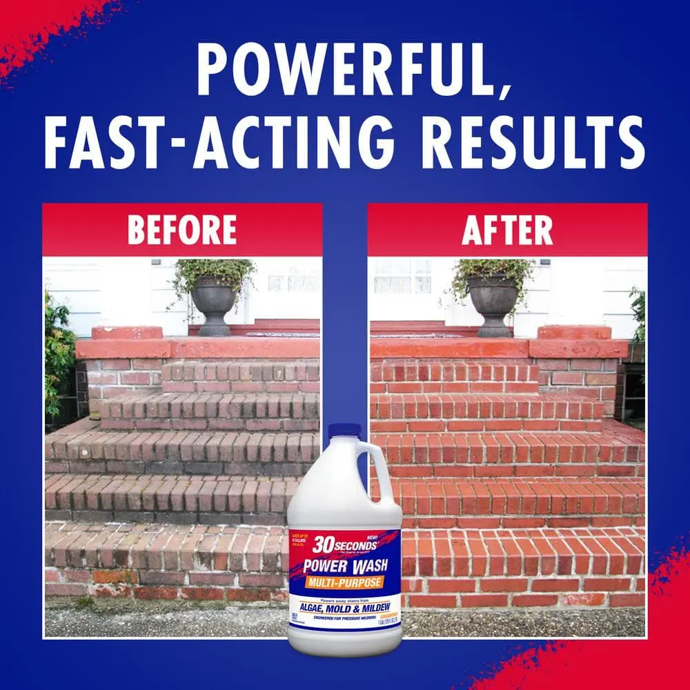 30-Seconds Power Wash Concentrate quickly eliminates outdoor stains. Formulated with bleach, it penetrates and dissolves discoloration and blemishes, removing stains from mold, mildew, algae, oil, dirt, and grime. It can be used in your pressure washer tank or applied directly to stubborn stains. This powerful cleaner works on various outdoor surfaces and effectively eliminates musty odors at their source. Its anti-corrosive formula not only enhances pressure washer performance but also helps protect its components.