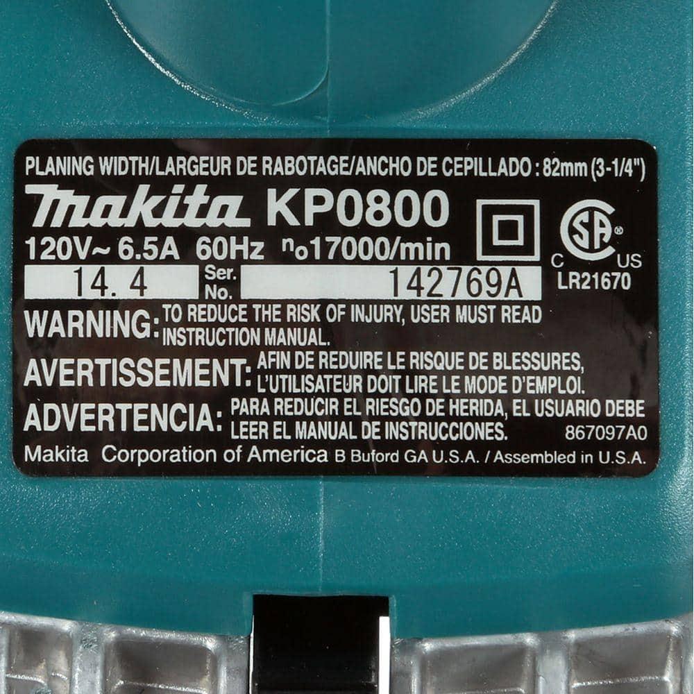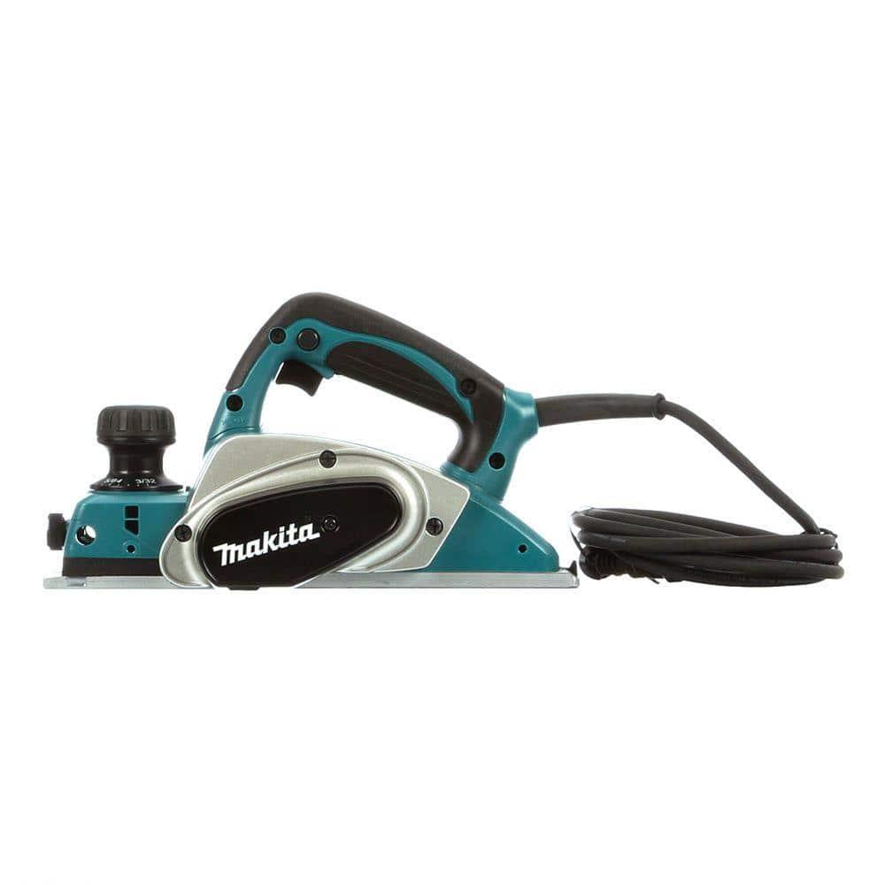 The Makita 3-1/4 in. Planer offers powerful performance and ease of use with its 6.5 Amp motor, delivering high efficiency and a superior power-to-weight ratio. It features a 2-blade cutter head spinning at 17,000 RPM for effective stock removal and fine finishes. The planer is equipped with a precision-machined aluminum base for accurate planning and double-edge carbide blades for durability.