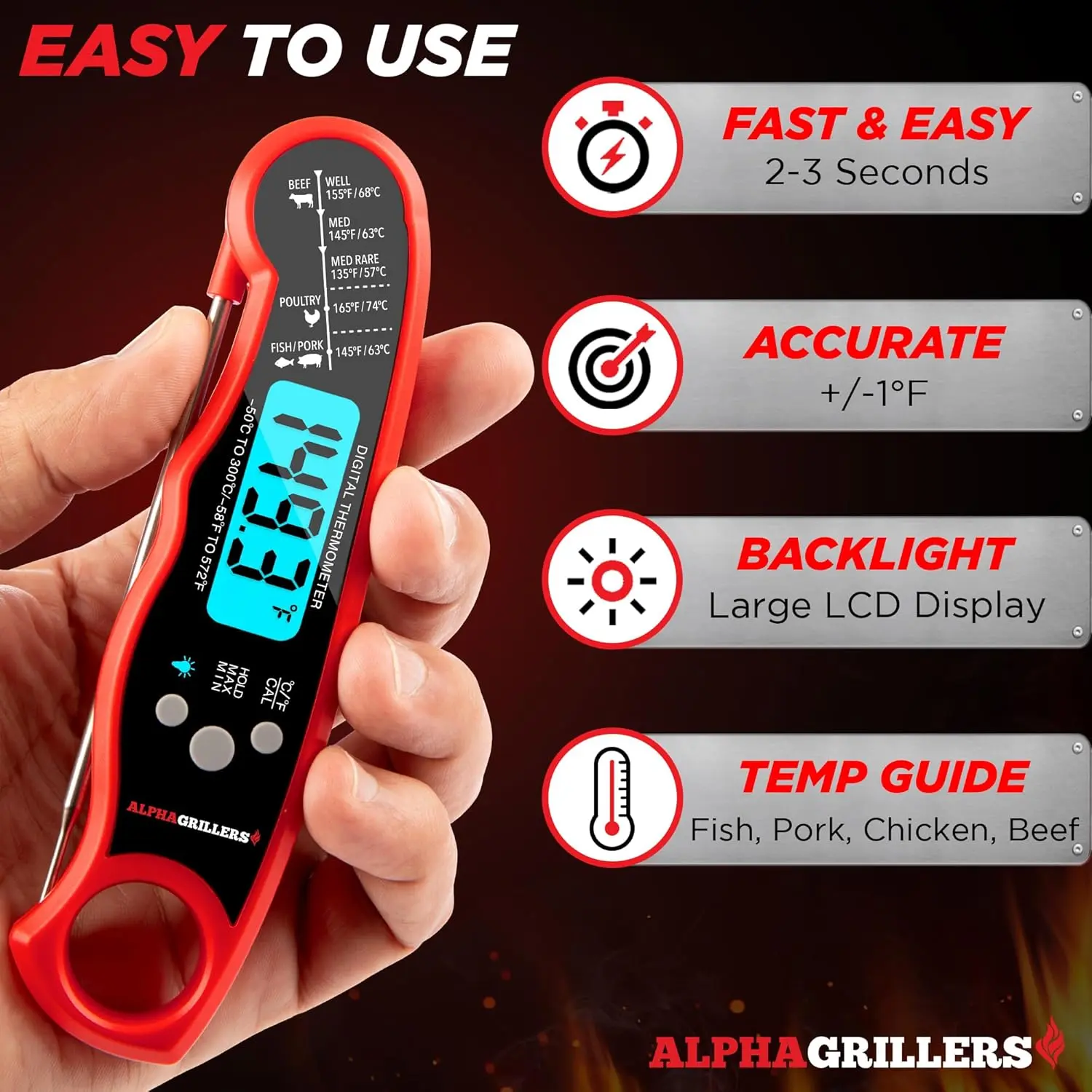 Instant Read Food Thermometer: This thermometer provides accurate readings in 2-3 seconds with a temperature probe. It comes pre-calibrated and includes a recalibration feature, along with instructions and a meat temperature chart.Multi-Use: Ideal for grilling, baking, deep frying, and candy making, it's suitable for air fryers, ovens, grills, and more.Easy-Read Display: The large dial features a bright blue backlight for visibility in any lighting, making it an essential cooking accessory.Water-Resistant: Rated IP66, this thermometer is water-resistant and can be easily cleaned under running water.Great Gift: Packaged in an elegant foam-lined box, it's a perfect gift for any cooking enthusiast.Includes Battery: Comes with an additional CR2032 battery in child-safe packaging.