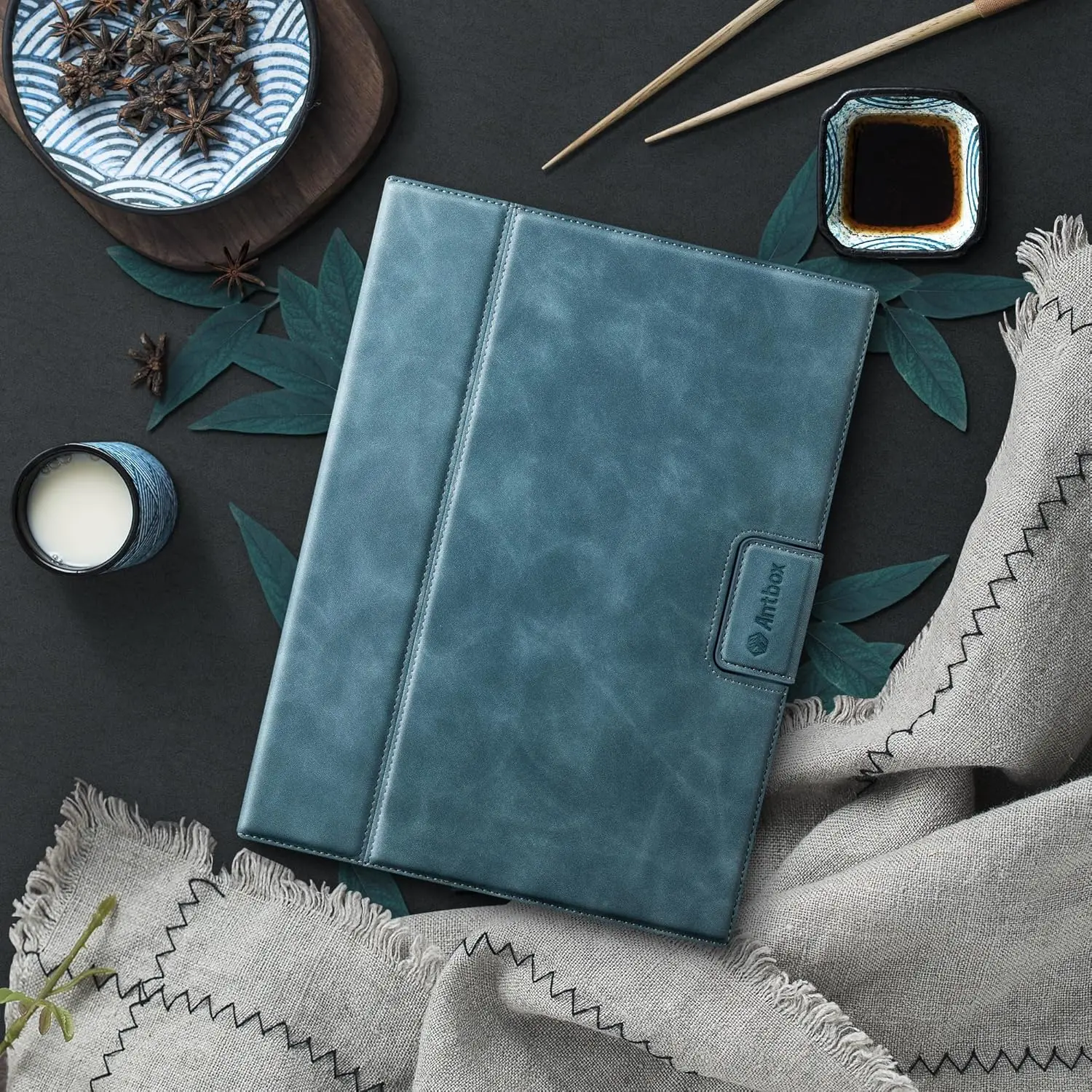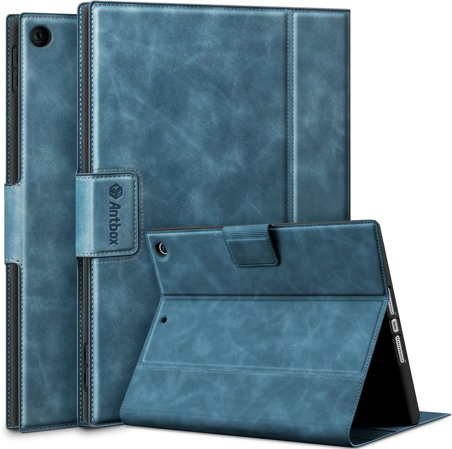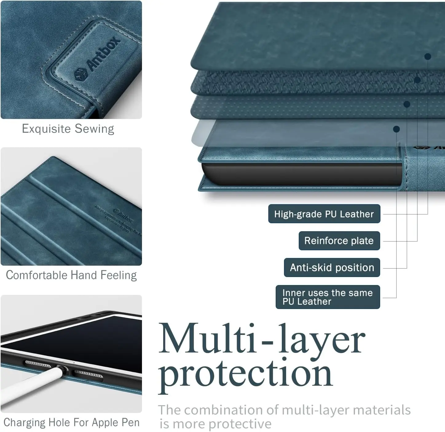 The Antbox Case for iPad 9th/8th/7th Generation (10.2-inch) is a hybrid PU leather case offering protection and functionality. It includes a built-in pencil holder, a flexible TPU back cover for durability, and an ergonomic stand mode for comfortable typing and viewing. The auto sleep/wake feature helps conserve battery life, and it offers precise cutouts for all buttons and ports. This case is designed specifically for iPad models A2602–A2605, A2270–A2430, and A2197–A2200.
