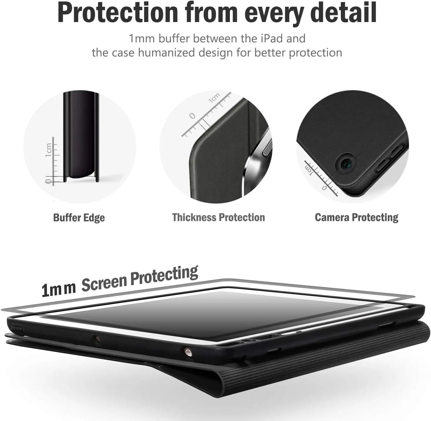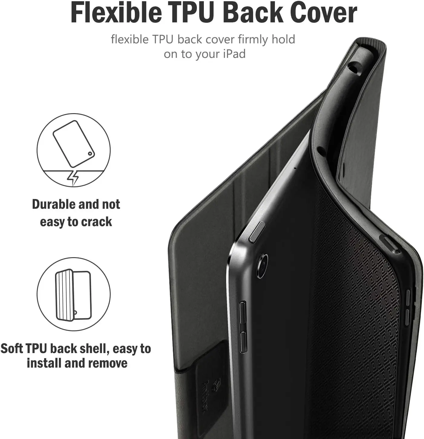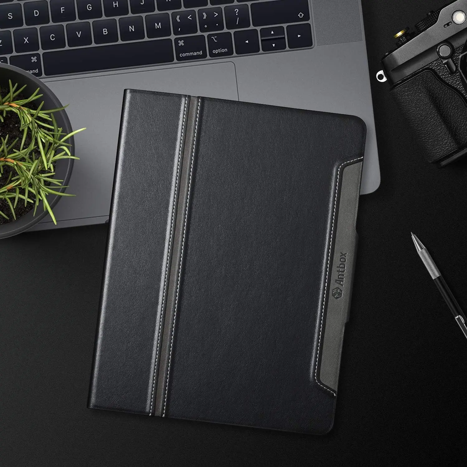 The Antbox Case for iPad 9th/8th/7th Generation (10.2-inch) is a versatile, protective case designed for models from 2019 to 2021. Made of flexible TPU for durability, it includes precise cutouts for seamless access to ports and buttons. Features include a built-in Apple Pencil holder with a push-out function, an auto sleep/wake cover for power efficiency, and ergonomic viewing and typing stand modes. Its vegan leather exterior provides a sleek, professional look while maintaining excellent functionality.
