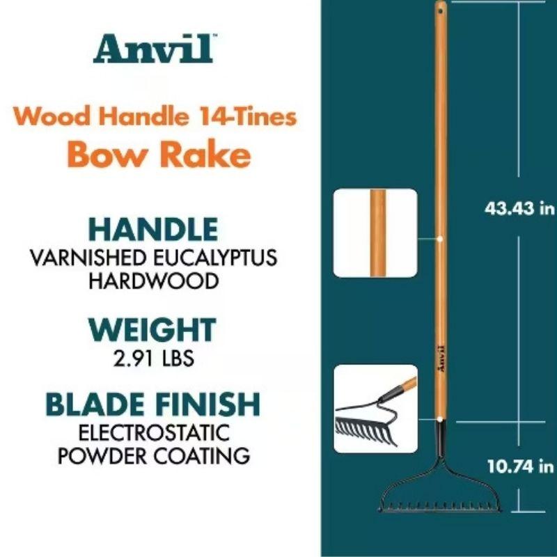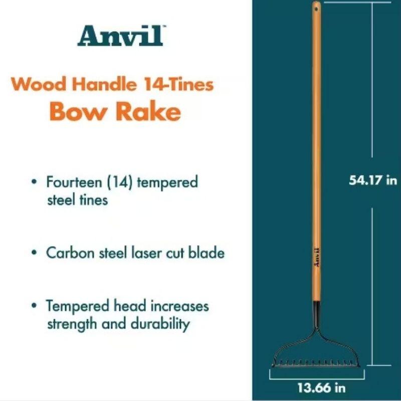 The Anvil 47-inch Wood Handle 14-Tines Garden Bow Rake is a sturdy gardening tool designed for efficient soil and debris management. It features a long, wooden handle for comfortable use and a 14-tine head for effective raking and leveling. The bow shape of the rake head helps in handling large areas and provides durability. Ideal for gardening tasks like spreading mulch or removing leaves. Dimensions Handle Length (in.):47 Product Depth (in.):54.17 in Product Height (in.):2.87 in Product Width (in.):13.66 in Rake Width (in.):13.66 Tine length (in.):2.83 Details Features:Coated tines Garden Tool Handle Style:Long Handle Handle Material:Wood Number of tines:14 Product Weight (lb.)2.91 lb Rake Tine Length (in.):2.50-2.99 Rake Type:Bow Rake Shape:Bow Tine Material:Steel