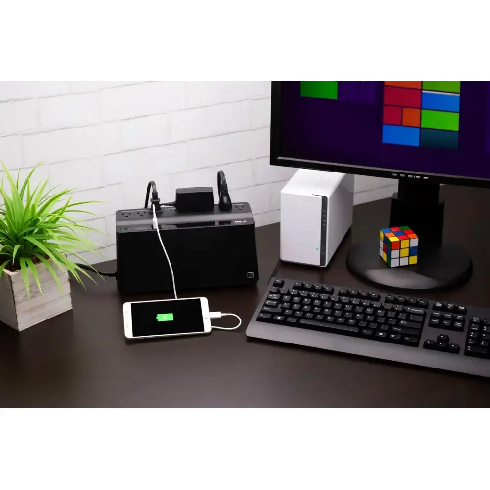The APC Back UPS 650VA/360W provides reliable backup power with a 650VA / 360W battery capacity, ensuring your essential devices stay powered during outages. It features 7 NEMA 5-15R outlets to connect multiple devices and a USB Type-A charging port for convenient mobile device charging. With built-in surge protection, your equipment is safeguarded against power surges and spikes. Its floor or wall mountable design offers flexible placement options, while the compact, black design makes it ideal for home or office setups. Additionally, Automatic Voltage Regulation (AVR) helps maintain safe voltage levels without unnecessary battery usage
