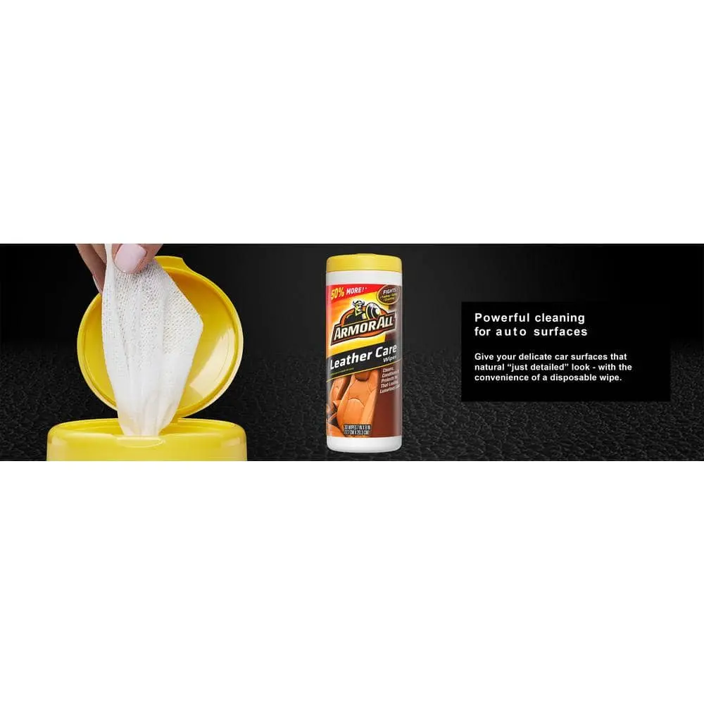 Armor All Leather Care Wipes are designed to help maintain the luxurious look and feel of your car's leather surfaces. These convenient wipes clean, condition, and protect in one easy step. The advanced formula penetrates deep into the leather grain to lift dirt and grime, while conditioning agents restore softness and enhance the leather's natural beauty. Blocking agents provide protection against spills, stains, cracking, fading, and premature aging. Ideal for car interiors, these versatile wipes also work great on handbags, furniture, and luggage. The Moisture Lock Lid keeps wipes fresh for up to one year.