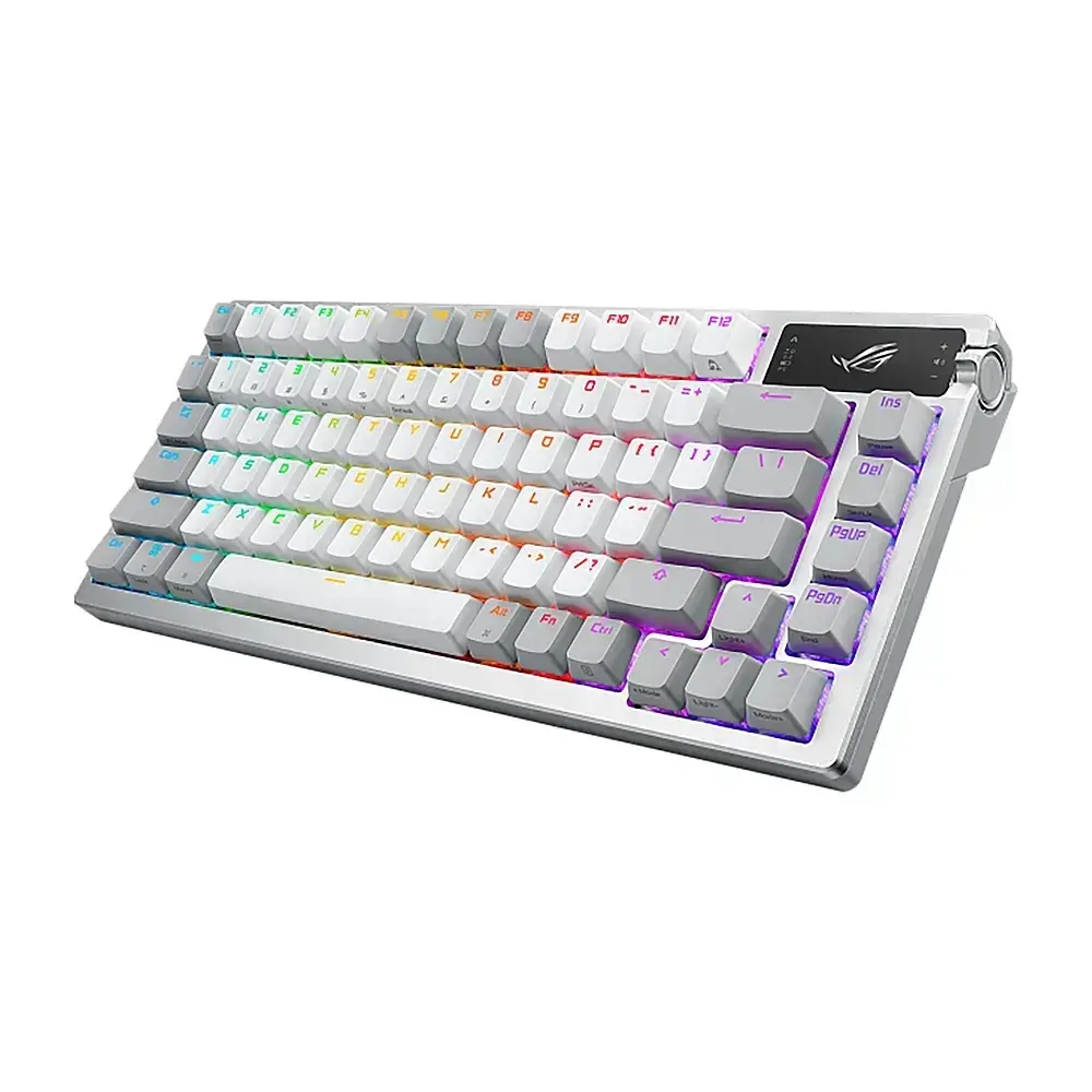 The ROG Azoth is a 75% gaming keyboard packed with DIY features typically found on high-end custom keyboards. It boasts a metal top cover with a silicone gasket mount and three-layer dampening, hot-swappable, pre-lubed ROG NX mechanical switches, and a keyboard stabilizer. The keyboard also includes ROG PBT doubleshot keycaps and a bundled switch lube kit for an exceptional typing experience. Additionally, the ROG Azoth features an OLED display with intuitive controls, versatile tri-mode connectivity with SpeedNova wireless technology in 2.4 GHz mode, three adjustable tilt positions, and support for MacOS.