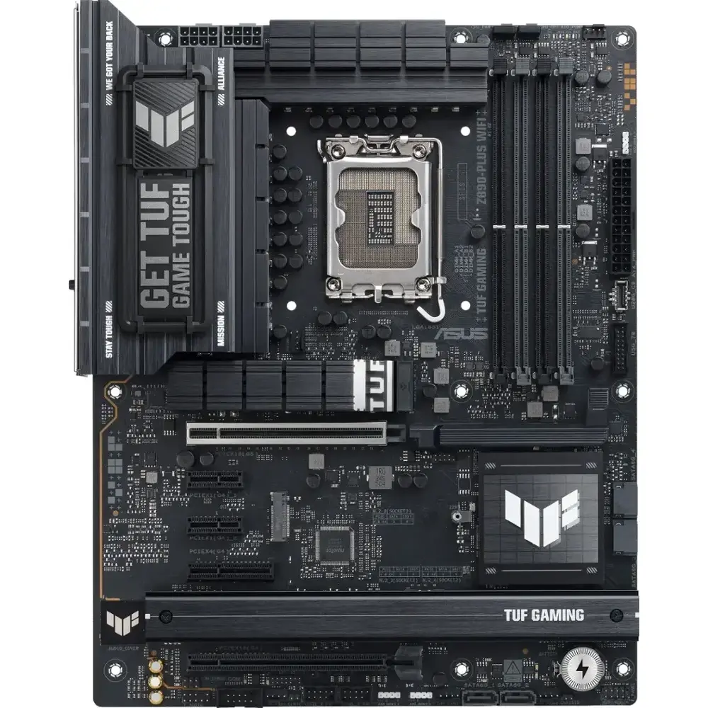 The TUF GAMING Z890-PRO WIFI ATX motherboard is optimized for advanced AI PC setups, featuring robust 16+1+2+1 80A DrMOS power stages for reliable power delivery. It supports DDR5 memory slots and PCIe 5.0 for lightning-fast performance. The motherboard offers versatile connectivity with DisplayPort, HDMI, two Thunderbolt 4 USB Type-C ports, and a front panel USB 20Gbps Type-C port.
