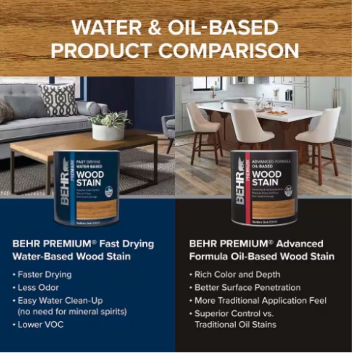 BEHR PREMIUM Fast Drying Water-Based Wood Stain offers exceptional color control and ease of application for interior wood staining projects. This formula can be customized to various popular interior colors, providing a warm finish to any wood surface. It dries quickly and evenly in just 1 hour, allowing for efficient completion of projects. With 1-coat coverage capability and the flexibility to rework for up to 48 hours after application, it ensures smooth application and easy workability. Additionally, it has less odor compared to oil-based products and can be cleaned up easily with soap and water.