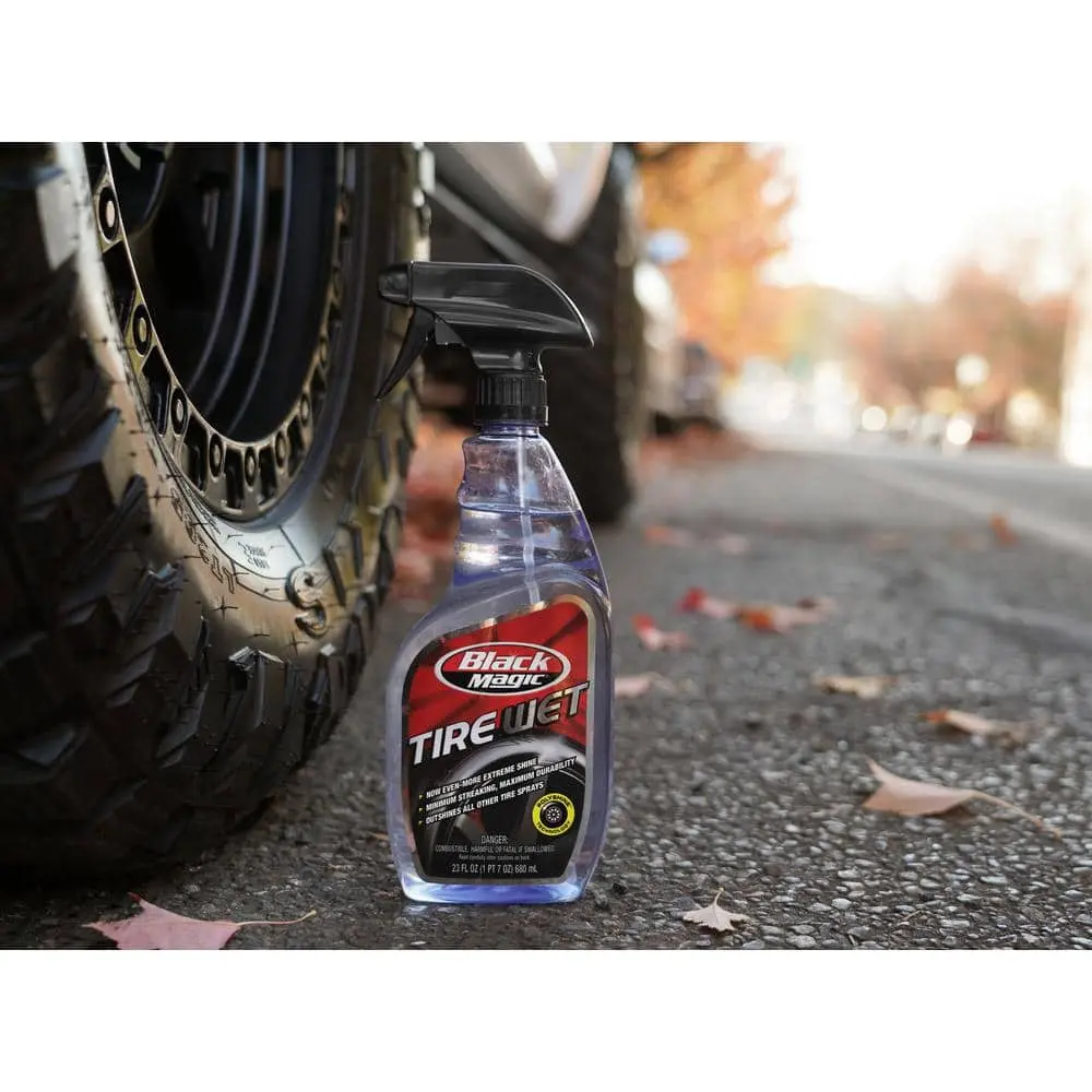 Black Magic Tire Wet is America's top choice for tire shine, providing your tires with a glossy, long-lasting wet black finish with just one simple spray. Specially designed to deliver the brightest shine of any leading tire spray, Tire Wet dries quickly to minimize sling on your wheel wells.