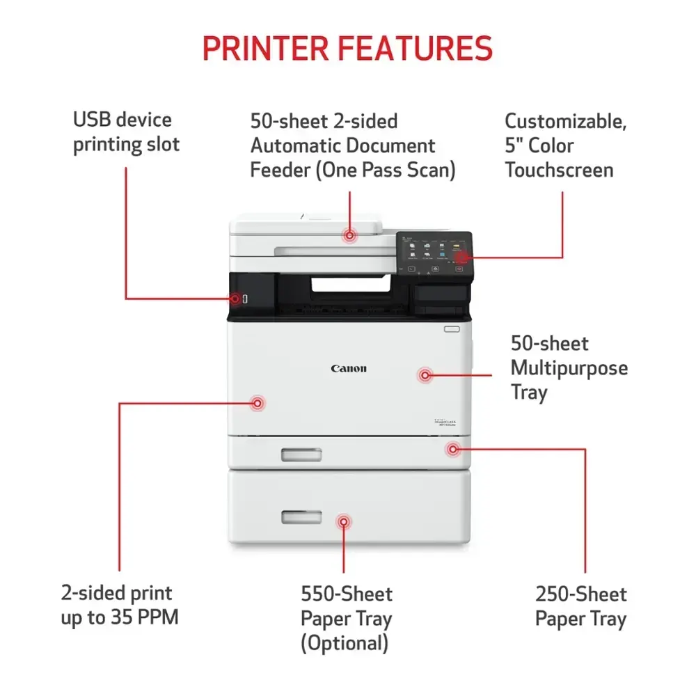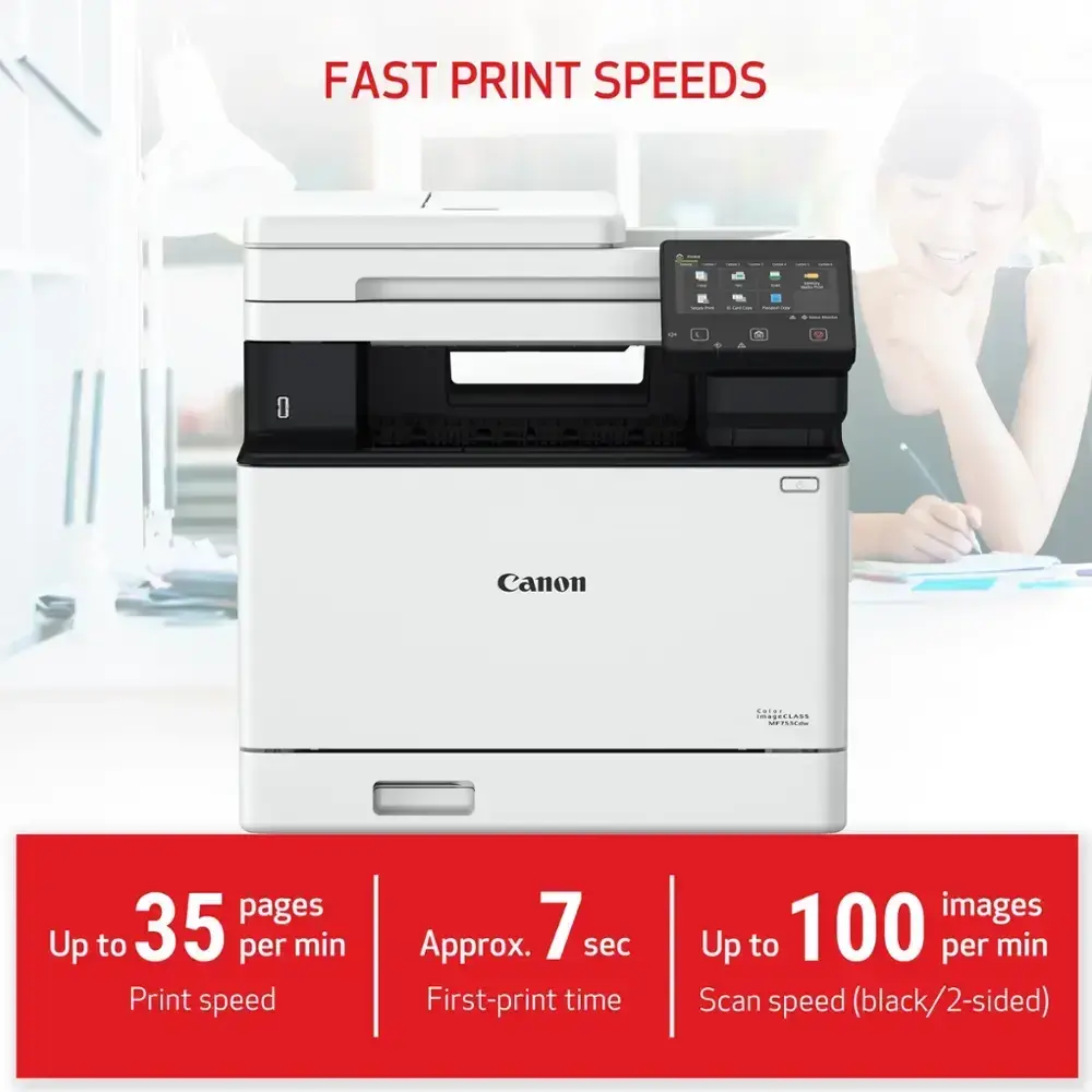 The Canon imageCLASS MF753Cdw Wireless Color All-In-One Laser Printer with Fax delivers high-speed printing up to 35 pages per minute (ppm) and combines print, scan, copy, and fax capabilities in one efficient device. It features wireless, Ethernet, and USB connectivity, along with mobile printing support through AirPrint, Google Cloud Print, and the Canon PRINT Business app. With high-quality color laser printing, it produces sharp text and vibrant images, ideal for professional documents. The printer includes a 250-sheet paper cassette, a 50-sheet automatic document feeder (ADF), and an intuitive 5-inch color touchscreen for easy operation. It also offers advanced security features, such as secure print and user authentication, and is ENERGY STAR® certified for energy efficiency.