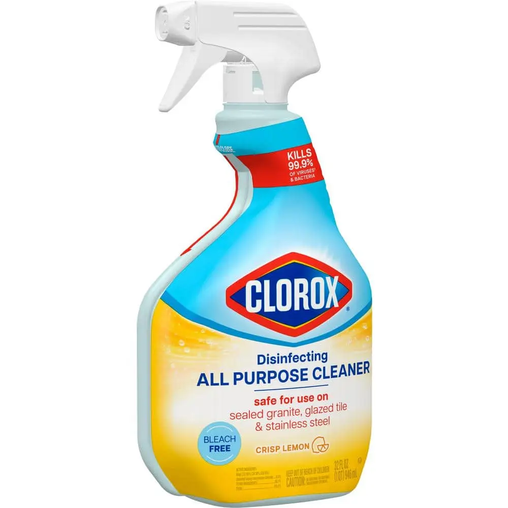 Clorox Disinfecting All Purpose Cleaner is designed to tackle everyday messes like grease, grime, and food stains on a variety of hard, nonporous surfaces such as kitchen sinks, counters, tubs, toilets, and more. This bleach-free cleaner leaves behind a refreshing Crisp Lemon scent without the harsh odor of bleach. It effectively kills 99.9% of bacteria and viruses, and helps prevent the growth of bacteria for up to 24 hours on non-food contact surfaces. Perfect for cleaning tough dirt, fingerprints, soap scum, and sticky messes, Clorox provides a long-lasting, fresh clean with confidence.