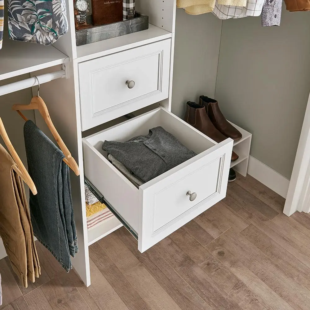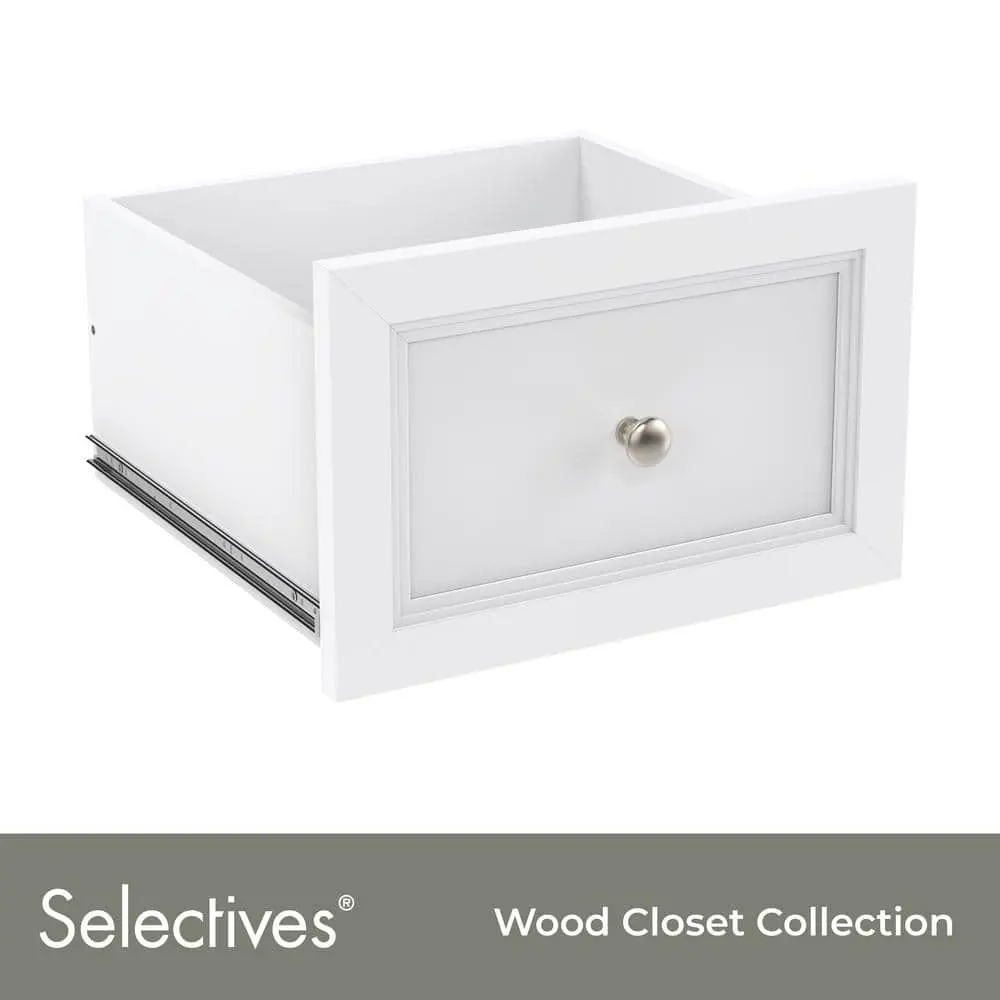 The ClosetMaid Selectives 10 in. H x 15 in. W White Wood Drawer with Silver Handle offers a 10 in. H x 15 in. W compact size, perfect for versatile storage in various spaces. The white wood finish gives it a clean and modern look that complements most décor, while the silver handle adds a sleek and stylish touch for easy access. With its durable construction, this drawer is built to last, offering reliable performance. It is also easy to assemble, ensuring a quick and simple setup. This drawer is ideal for organizing clothing, accessories, or small items