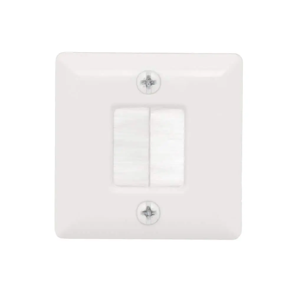The Commercial Electric Hole Saw Brush Wall Plate is designed for routing low voltage cables behind compact home theater and security systems. Its low-profile design is perfect for hiding connections to devices like speakers, cameras, and similar setups. The plate features metal mounting wings that ensure a secure fit, eliminating the need for a separate mounting bracket.