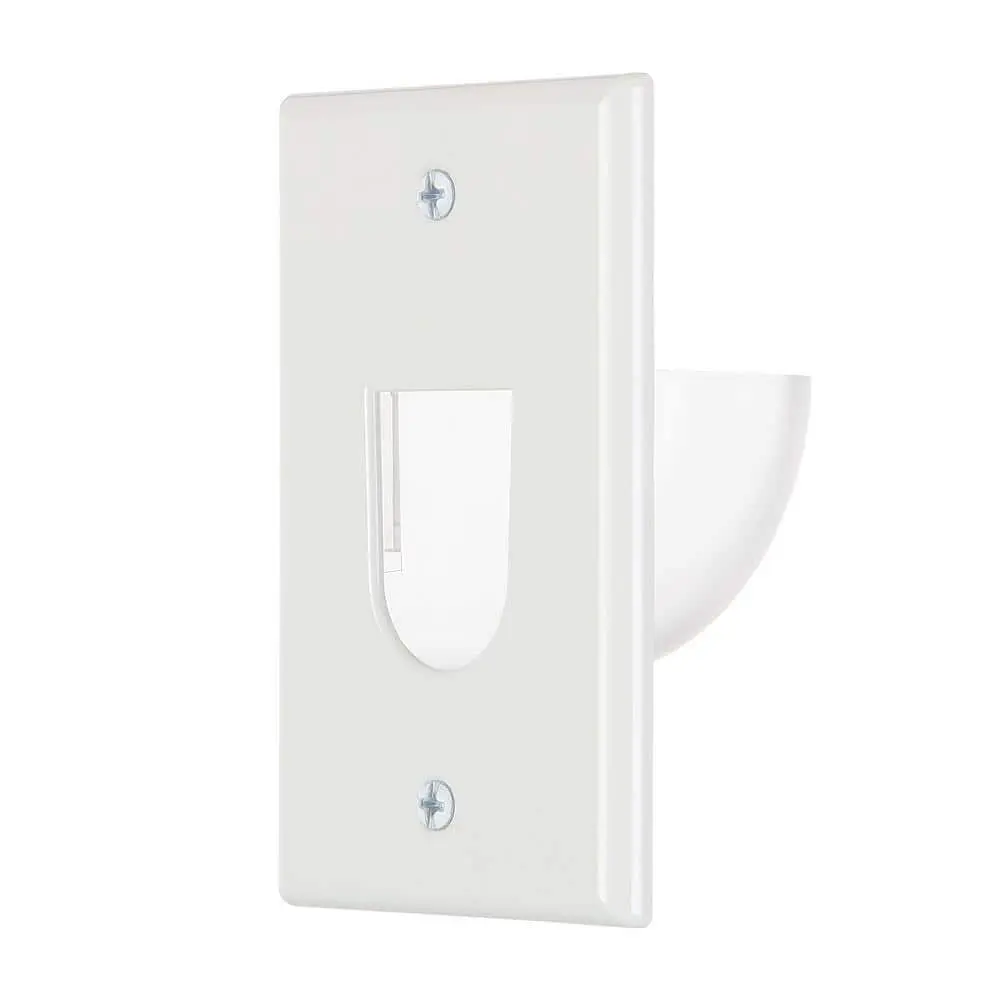 The Commercial Electric 1-Gang Recessed Cable Wall Plate is designed to conceal low-voltage cables within the wall, providing a sleek and organized way to manage cables for multi-media devices. Featuring a recessed bullnose, it can be installed with the opening facing up or down, ensuring a seamless transition between the wall and the plate. This design not only guides cables effectively but also helps maintain a clutter-free, clean appearance for any multimedia setup.