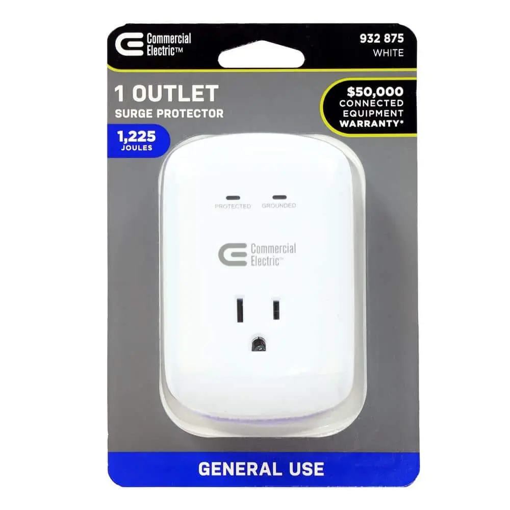 This power strip offers 1 surge-protected outlet with 1225 joules of surge protection. It includes a grounded indicator and a protected indicator for easy monitoring. Designed for indoor use only.