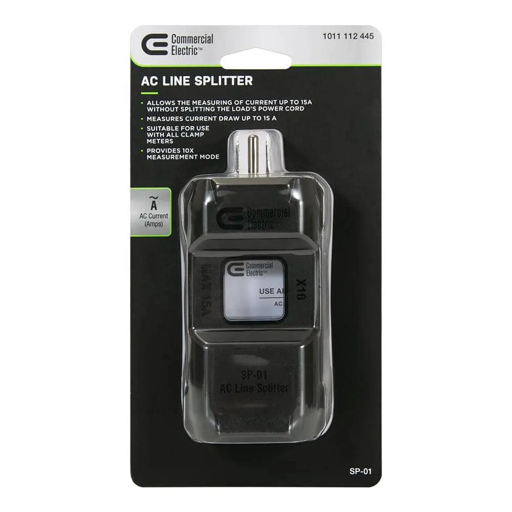 The Commercial Electric 120-Volt 10x AC Line Splitter (SP-01) allows for precise current measurements by separating hot, neutral, and ground wires on standard 120-Volt outlets. This ensures that the current clamp accurately measures load current without interference. The line splitter includes both a standard measurement section and a ten-times multiplier section, making it compatible with higher-range or less-accurate clamp meters. While designed for use with Commercial Electric clamp meters, it is also compatible with most other clamp meter brands, offering broad functionality.