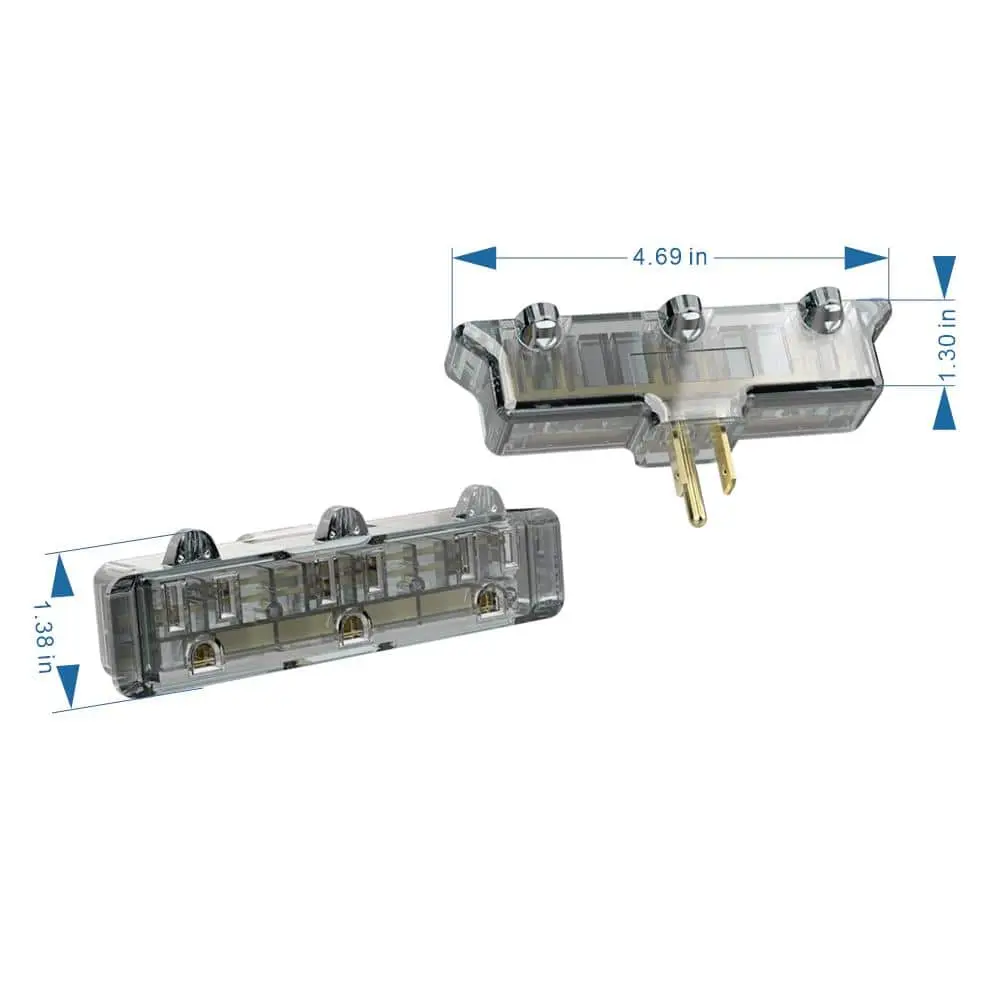 The 3-outlet power adapter plug with lighted ends is a 15 Amp adapter that converts a single outlet into 3 grounded outlets. It supports devices up to 1875 watts and features a built-in light to indicate when the power is on. Ideal for general-purpose use in homes, offices, and commercial settings.