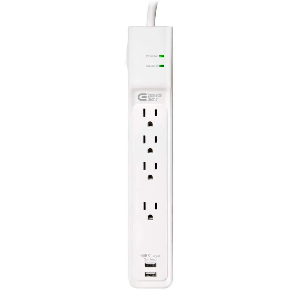 The CE 4-Outlet USB Power Strip Surge Protector is perfect for protecting home and office electronics. It features 2 USB charging ports, a widely-spaced outlet for large AC plugs, and a 4 ft. cord. Ideal for safeguarding devices like computers, phones, printers, stereos, and more, the 3.4 Amp USB ports keep tablets, smartphones, and other electronics charged and ready.