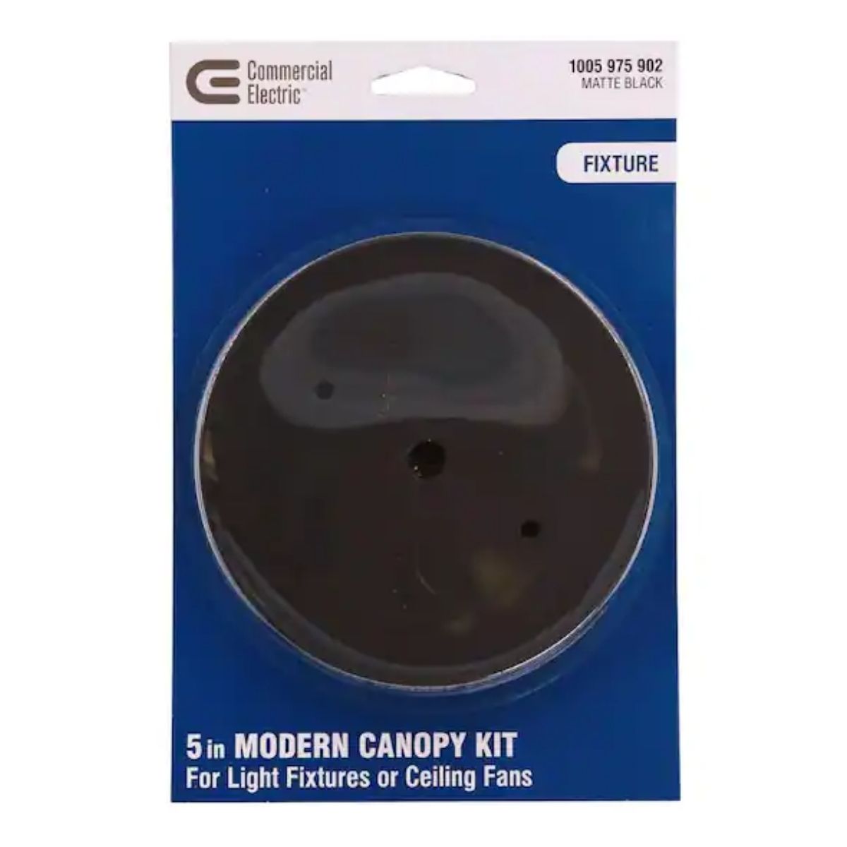 The Modern Canopy Kit for Ceiling Light Fixtures, with its 5-inch Matte Black Finish, offers the convenience of suspending a light fixture in any desired location within your home. Its sleek and contemporary design seamlessly integrates with your existing decor, while effectively concealing an unattractive ceiling box.