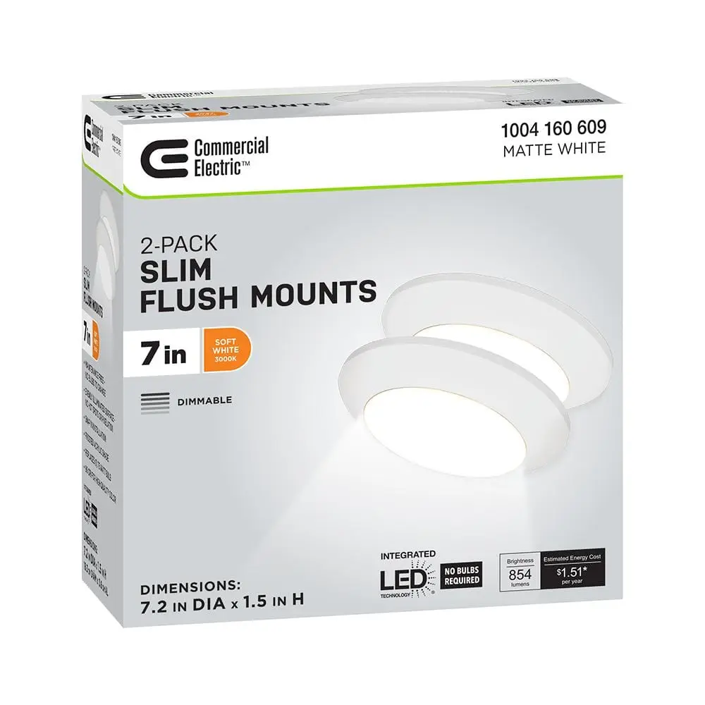 The Commercial Electric 7-inch White LED Flush Mount Ceiling Light is a compact yet powerful lighting solution. Emitting 854 lumens of soft white (3000K) illumination while using only 12.5 watts, it replaces outdated 75-watt incandescent bulbs, offering energy savings and long-lasting performance. Made of durable metal, this fixture is maintenance-free, requiring no bulb replacements. Ideal for residential spaces such as closets, pantries, utility rooms, stairwells, attics, basements, laundry rooms, and storage areas.