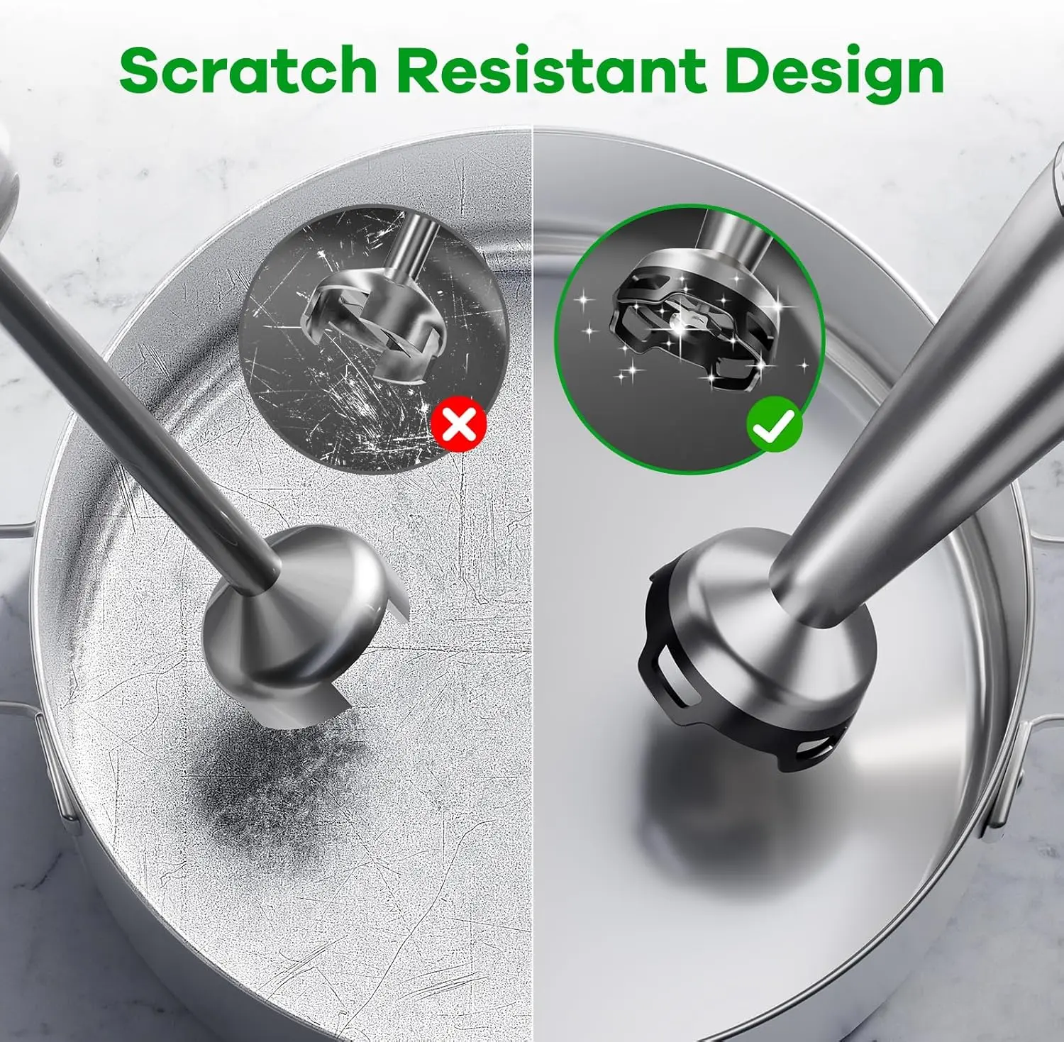 No More Lumps: The powerful 1100W copper motor ensures quick blending and chopping for velvety smooth purees.Easy Variable Speed Control: The pulse-activated sensor lets you intuitively adjust speed from low to high, minimizing splatter while emulsifying or whipping.Effortless Clean-Up: A food-grade nylon blade guard reduces suction and prevents scratches on your cookware, keeping your kitchen clean.Comfortable Grip: The ergonomic, non-slip handle ensures comfort during continuous blending, making it a great gift for food lovers.Versatile Attachments: Multiple detachable accessories make cleaning a breeze. UL approved for safety and durability, with lifelong support available.Safe and Durable: Designed for use with hot ingredients, the reinforced BPA-free blades easily blend tough items.Buy with Confidence: Note: The blender can crush ice but shouldnt be used for long periods or with frozen fruits. Contact our customer service for any inquiries.