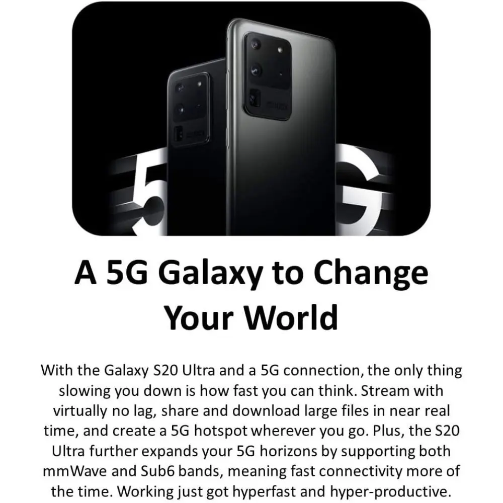 Experience cutting-edge technology and stunning visuals with the Samsung Galaxy S20 Ultra 5G. This flagship smartphone is engineered for those who demand excellence in performance and photography.