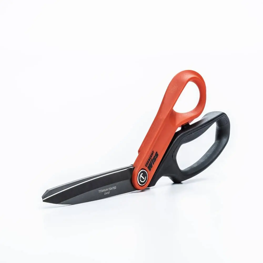 The Crescent Wiss 10 in. Titanium Coated Offset Tradesman Scissors are built for durability and precision in demanding tasks. Featuring titanium-coated blades, they deliver long-lasting sharpness and resistance to corrosion. The offset handle design ensures enhanced cutting control and comfort, making them perfect for heavy-duty use across various materials like paper, cardboard, and more