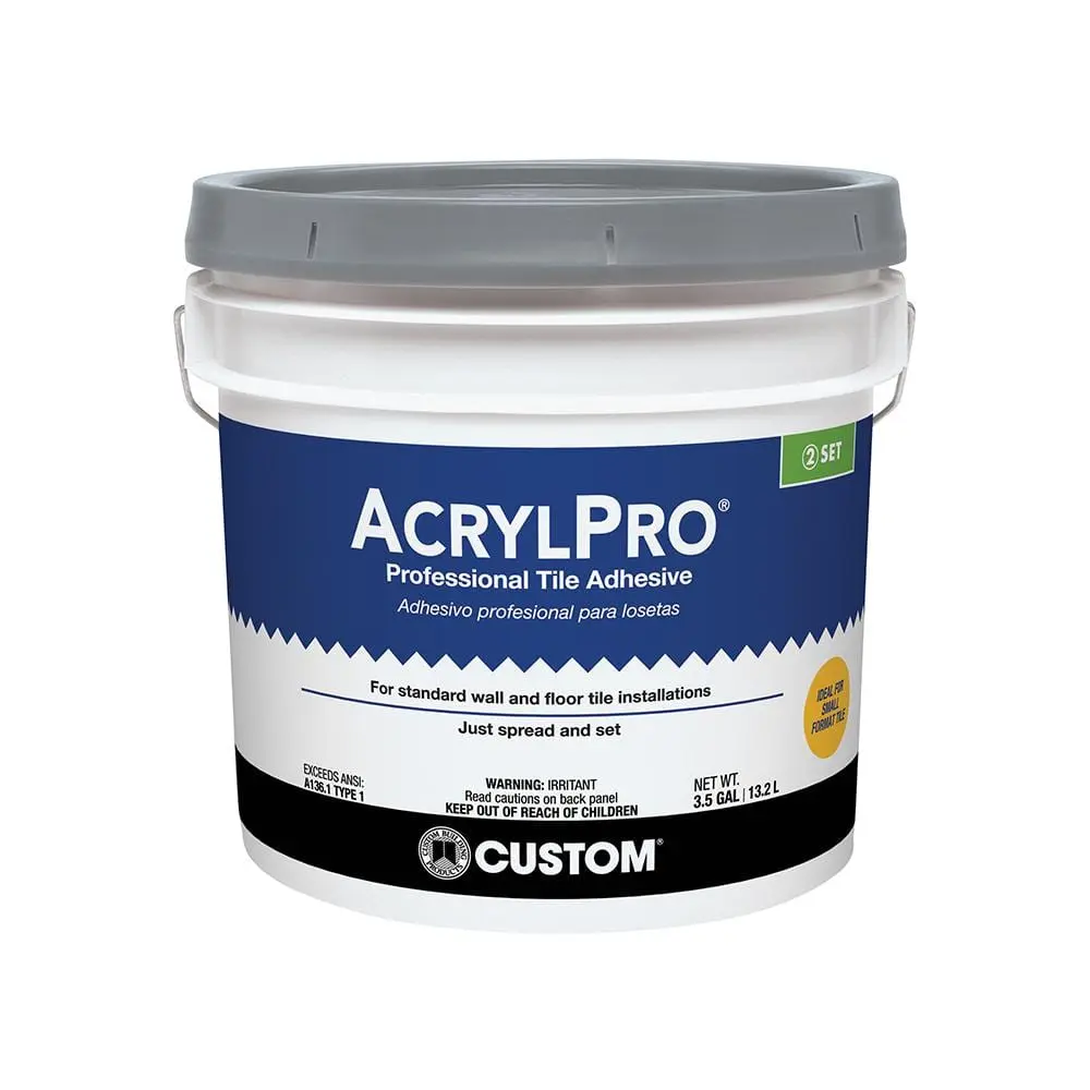 The Custom Building Products AcrylPro 3.5 Gal. (14 qt.) Tile & Stone 72 Hr. Dry Time Professional Tile Adhesive offers a high-quality solution for tile installations. The 3.5 Gal. (14 qt.) size provides ample coverage for larger projects, making it perfect for extensive flooring jobs. With a 72-hour dry time, this adhesive is designed for installations that require an extended setting period. Ideal for both tile and stone surfaces, it ensures strong adhesion for ceramic, porcelain, and stone tiles. This professional-grade adhesive delivers a strong bond, ensuring long-lasting and durable tile installations