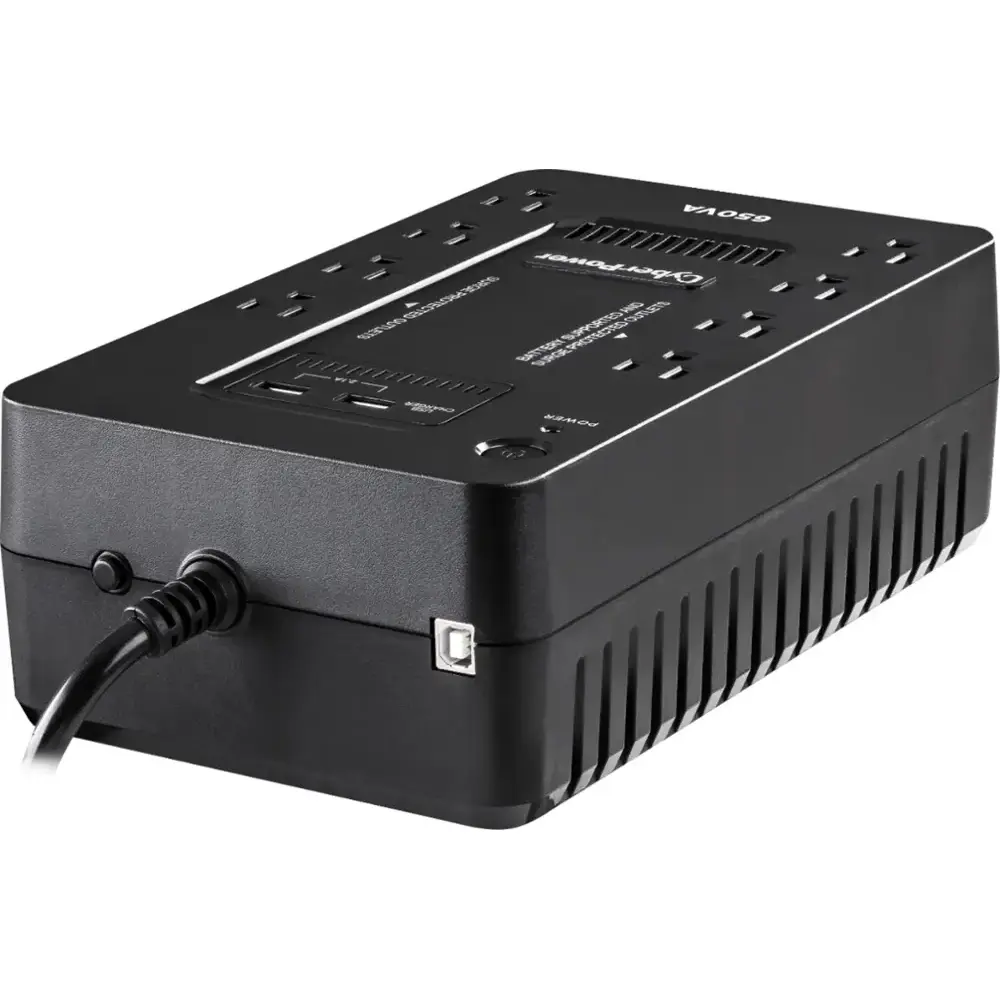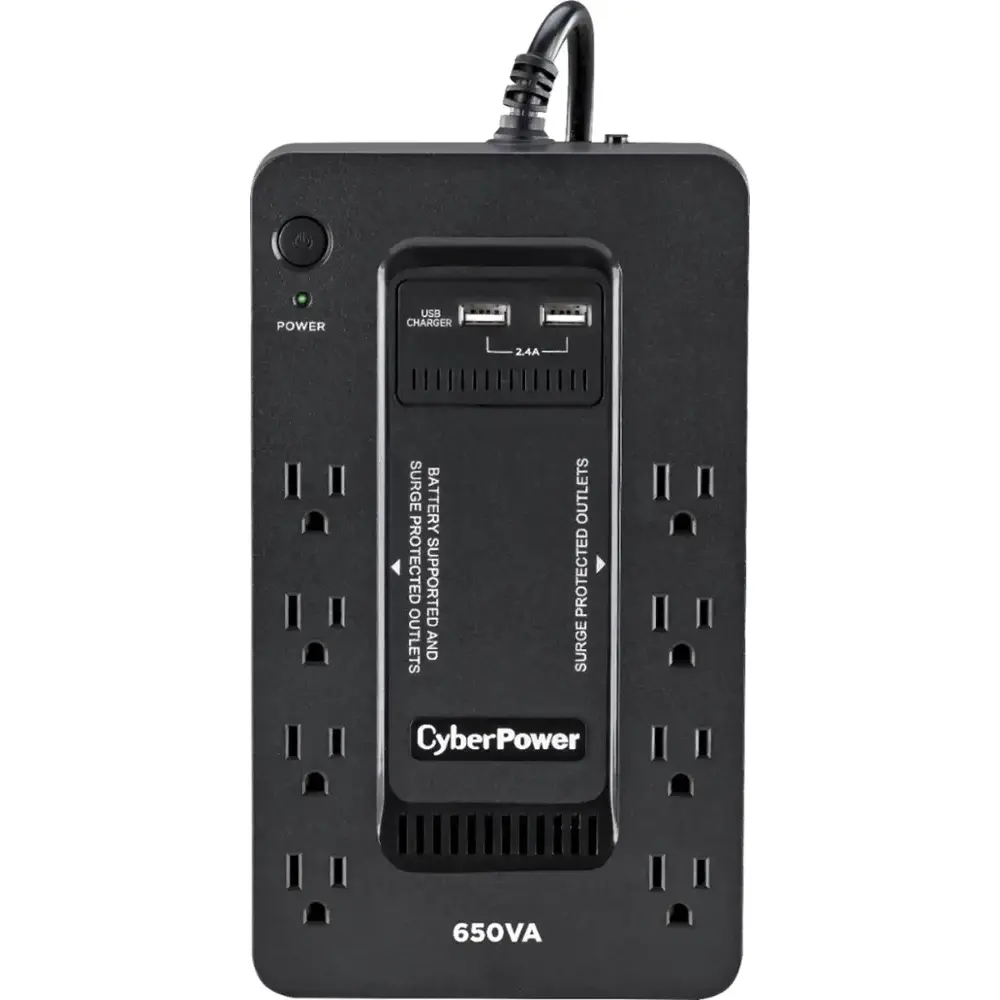 The CyberPower 650VA Battery Back-Up System delivers dependable protection for your essential electronics. With a 650VA / 360W capacity, it provides reliable battery backup power during outages, keeping your devices running without interruption. Equipped with 8 outlets, including 4 battery backup and surge protection outlets and 4 surge-only outlets, it safeguards your equipment from harmful power surges and spikes. Its compact design makes it easy to fit into any workspace, while the LED status indicators offer clear, real-time system updates. Plus, it’s energy efficient, helping to reduce power consumption and lower energy costs