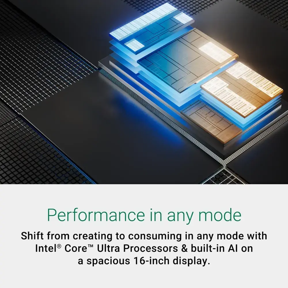• Versatile Performance: Seamlessly shift between tasks, from creating to consuming, on a spacious 16-inch display powered by Intel Core Ultra processors and built-in AI.