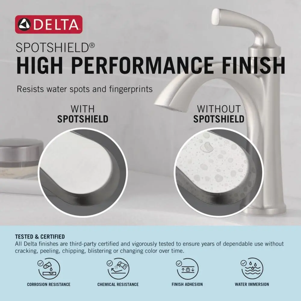 The Greydon Bath Collection features sleek, flowing lines that enhance any bathroom environment. Equipped with Delta SpotShield Technology, this faucet offers antimicrobial protection that helps keep it cleaner for longer by resisting water spots, fingerprints, and the growth of stain- and odor-causing microbes. Additionally, our WaterSense labeled faucets use at least 20% less water than the industry standard, allowing you to conserve water without sacrificing performance.