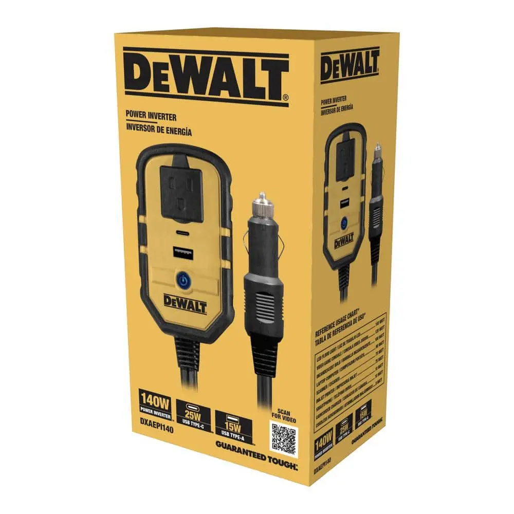 The DeWalt Power Inverter provides 140 watts of reliable household power, along with 25W USB Type C and 15W USB Type A ports for charging devices. Simply plug the inverter into your vehicle’s 12V DC outlet (cigarette lighter) and charge small electronics such as cell phones, tablets, and more. It features a fan-free, silent operation design and includes low voltage protection that automatically shuts off the inverter when your vehicle’s battery is low, preventing battery drain. The included mounting kit ensures the inverter stays securely in place during driving, with installation hardware provided.