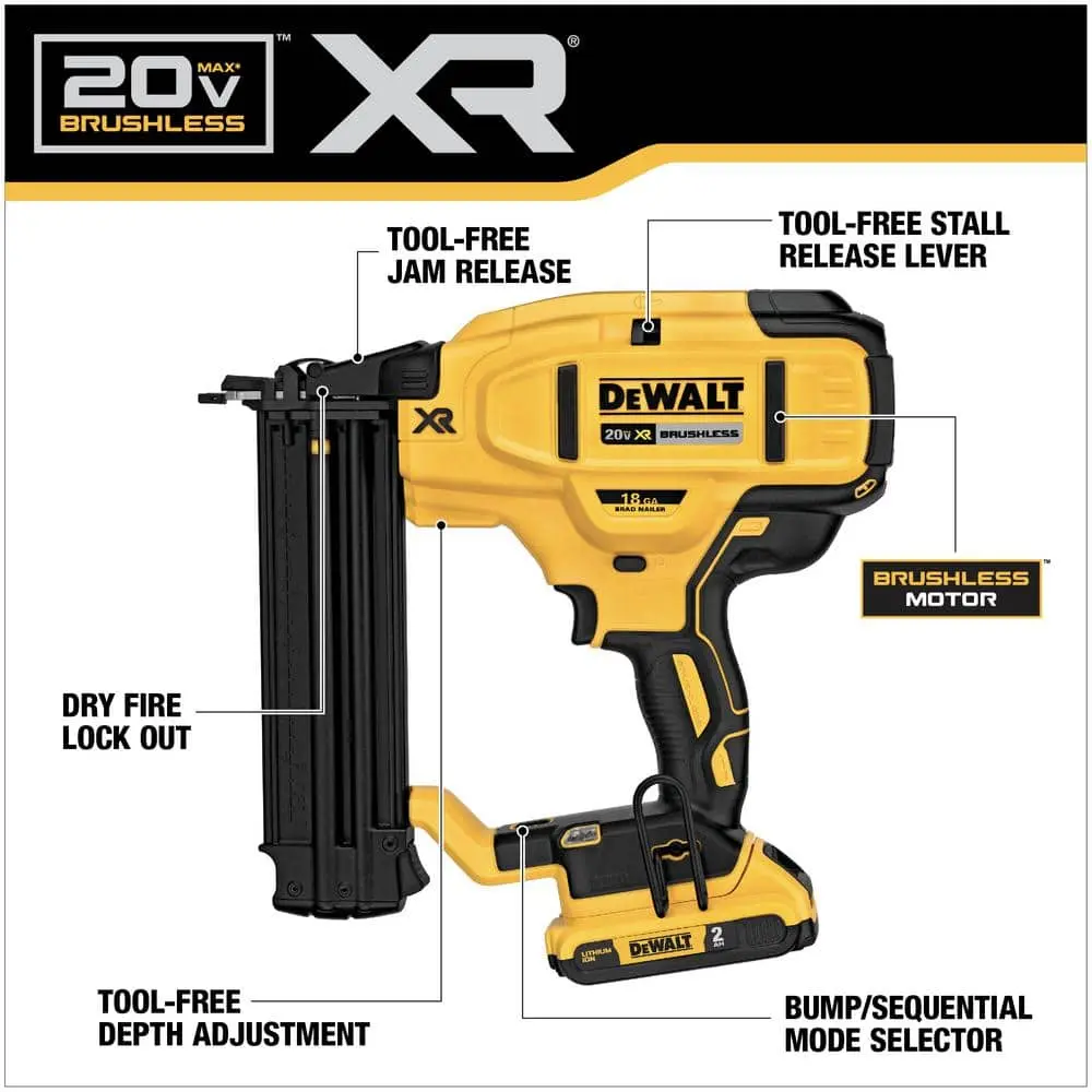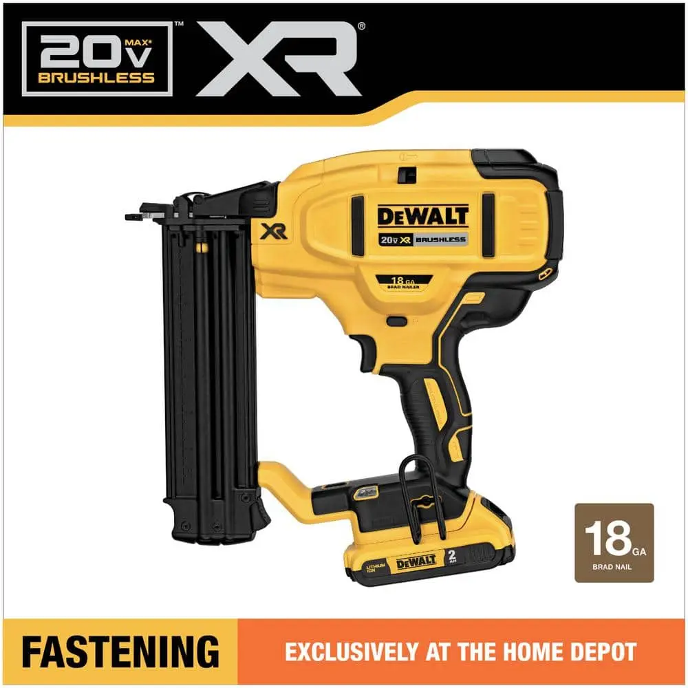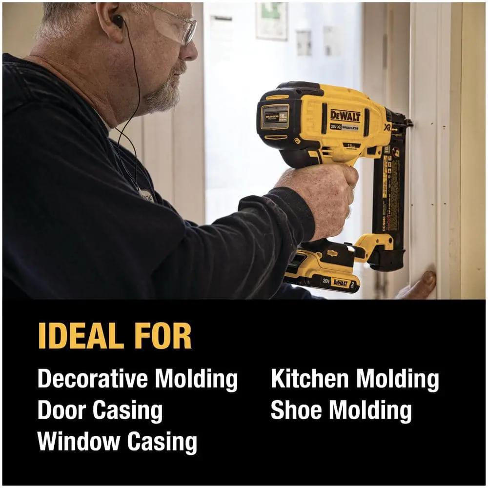 The DEWALT DCN680 18-Gauge Brad Nailer drives brad nails ranging from 5/8 inch to 2-1/8 inches, making it perfect for fastening decorative molding, casing, kitchen crown, and shoe molding. Powered by a brushless motor and a DEWALT 20V MAX Lithium-Ion battery, the DCN680 offers the performance of a pneumatic tool with the freedom of cordless operation—no need for gas, a compressor, or a hose. With maximum initial battery voltage of 20 volts (nominal voltage is 18 volts), this tool is designed to handle projects of any size efficiently.
