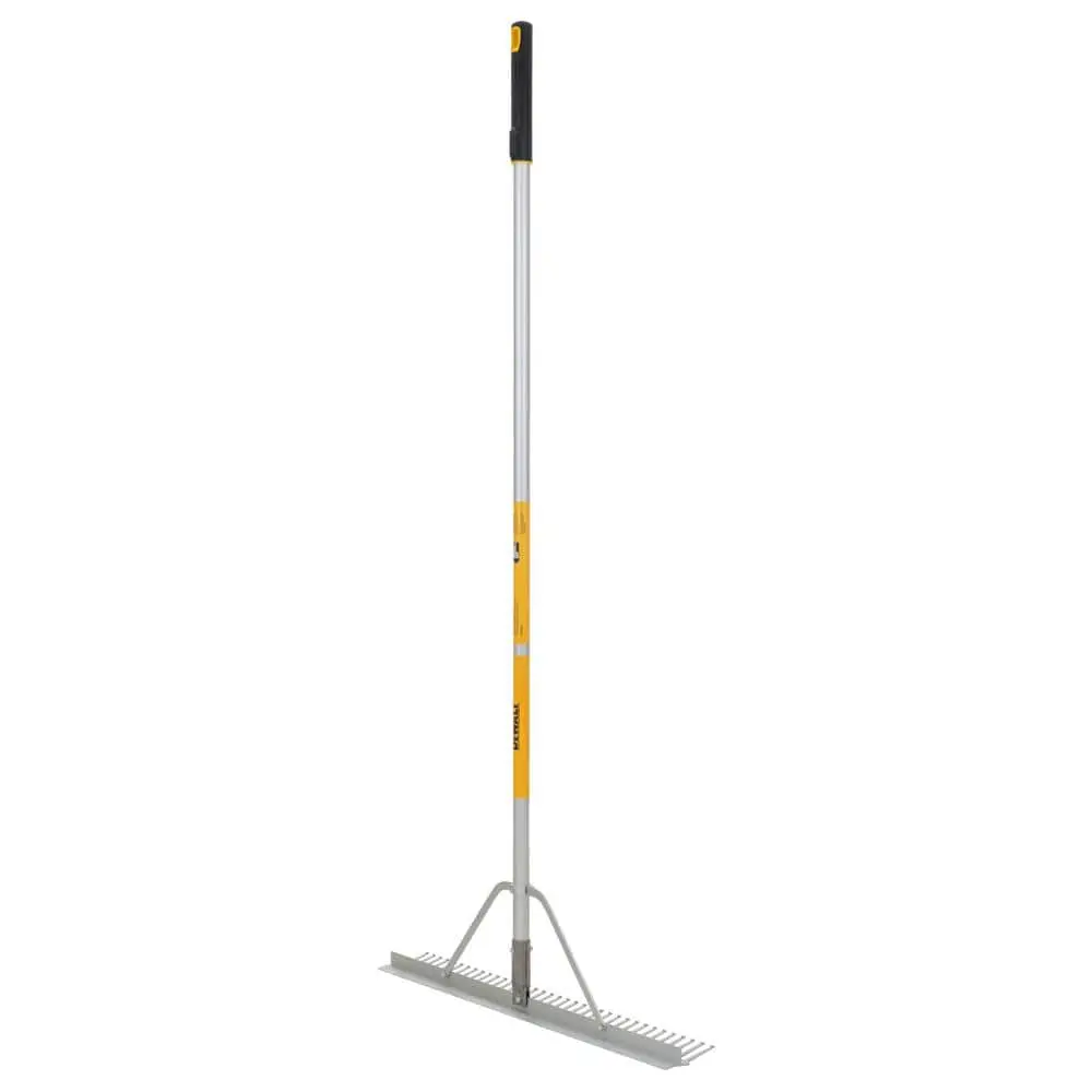 This durable landscape rake features corrosion-resistant aluminum tines and a leveler, making it ideal for smooth spreading, grading, leveling, and even removing landscape materials. The lightweight yet strong aluminum handle offers easy control, ensuring effortless use. The secure, long-lasting connection between the handle and rake head ensures professional-grade performance. Designed for comfort, the heavy-duty handle reduces strain on your knees and back during use, while the overmold end grip enhances hand comfort during extended sessions. For easy storage, an integrated hanging hole is included on the handle’s end.