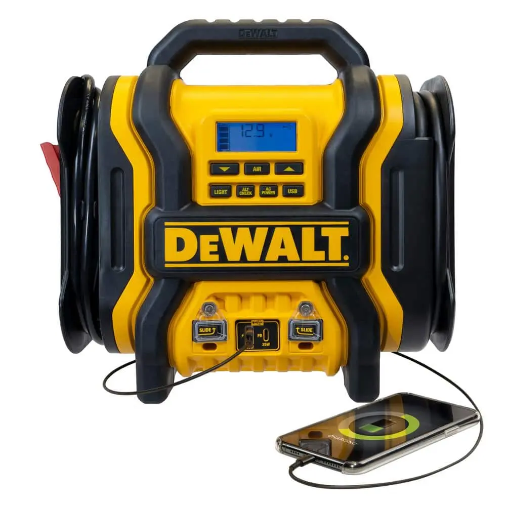 The DEWALT DXAEPS14 professional-grade power station is one of our most powerful jump starters, delivering 2000 peak amps to start vehicles up to V8. It includes a 500-Watt AC inverter, 15W USB-A port, 25W USB-C PD port, 120 PSI digital compressor, and an LED work light, all in a compact and portable design. Ideal for tailgating, camping, or roadside emergencies, the DXAEPS14 is the perfect solution whether your car won’t start, your phone’s battery is low, or your tire needs air.