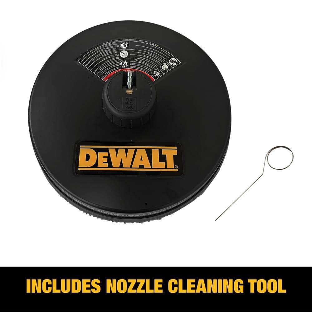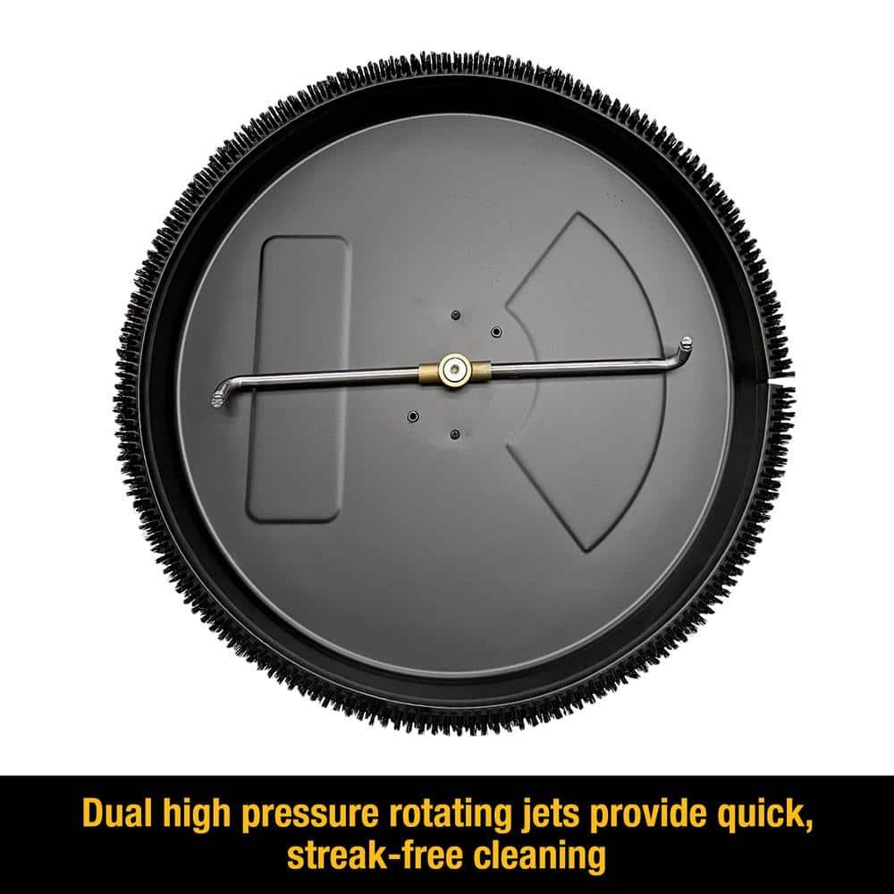 This surface cleaner features two high-pressure, rotating jets designed to deliver fast and streak-free cleaning. Constructed with a robust powder-coated steel shroud and durable stainless steel nozzles, it ensures long-lasting performance. The cleaner has a pressure rating of up to 3700 psi and is universally compatible with standard 1/4-inch quick-connect spray wand connections, making it suitable for most gas-powered pressure washers. With its 18-inch diameter, it effectively cleans large areas such as garage floors, driveways, patios, and decks quickly and efficiently. This model is intended for use with cold water only.