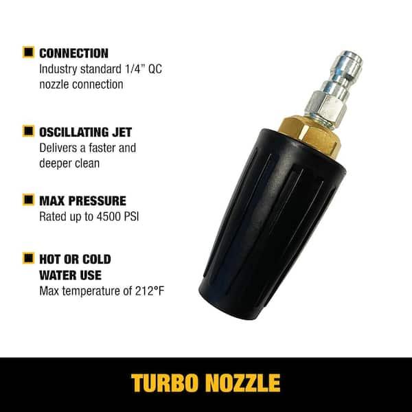 Introducing the DEWALT 4500 PSI Turbo Nozzle, your key to faster and more efficient cleaning. Designed for both hot and cold water pressure washers, this high-performance nozzle delivers a powerful oscillating jet that cuts cleaning time in half. Ideal for tough surfaces like brick, concrete, and vinyl, it connects easily to any standard quick-connect wand, making it the perfect tool for tackling heavy-duty jobs with ease. Upgrade your cleaning arsenal with the DEWALT Turbo Nozzle and experience the difference in performance and speed.
