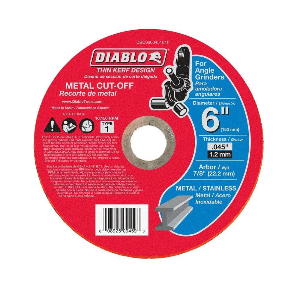 The DIABLO 6 in. x 0.045 in. x 7/8 in. Thin Kerf Metal Cut-Off Disc is designed for fast and precise cuts with its 0.045 in. thickness, offering minimal material loss and clean cuts. The 7/8 in. arbor ensures compatibility with most angle grinders, making it easy to use. Built with durable construction, this disc is perfect for cutting through metal such as steel and aluminum. Whether you're working on a professional project or DIY tasks, this single disc delivers reliable performance