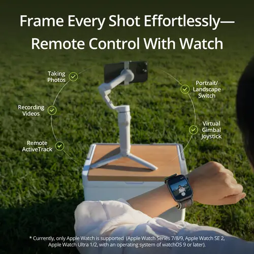 Control your Osmo Mobile 6 remotely via Apple Watch, view live previews, switch orientations, and trigger ActiveTrack—all from your wrist. Enhanced tracking for pets and new AI Editor functions like Parent-Child Mode make the gimbal even smarter. - Built-in 8.5" Extension Rod