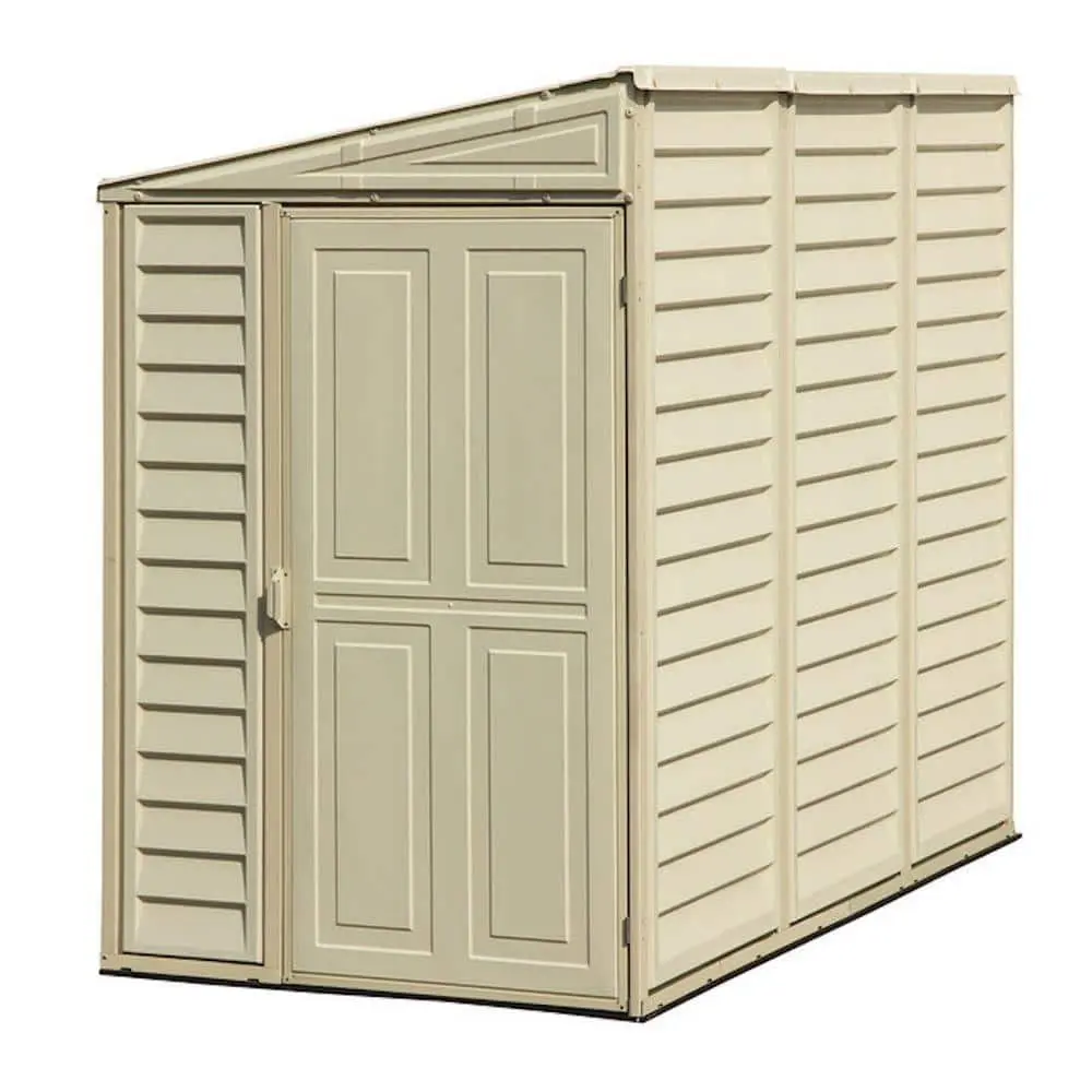 The Duramax Building Products Sidemate 4 ft. x 8 ft. Vinyl Shed with Foundation is a practical and durable storage solution for narrow spaces. Constructed with all-weather, maintenance-free vinyl, it provides long-lasting durability without the need for painting. The shed includes a foundation framing kit, making installation quick and easy while ensuring a solid base. It features a reversible side door for flexible access, and two ventilation vents can be placed on any panel to enhance airflow. The metal-reinforced wall columns add strength, allowing you to hang tools or install shelves. Made from fire-retardant vinyl, this shed offers added safety and peace of mind. With approximately 29.25 sq. ft. of storage space, it is ideal for maximizing limited outdoor areas, providing ample storage capacity in a compact design