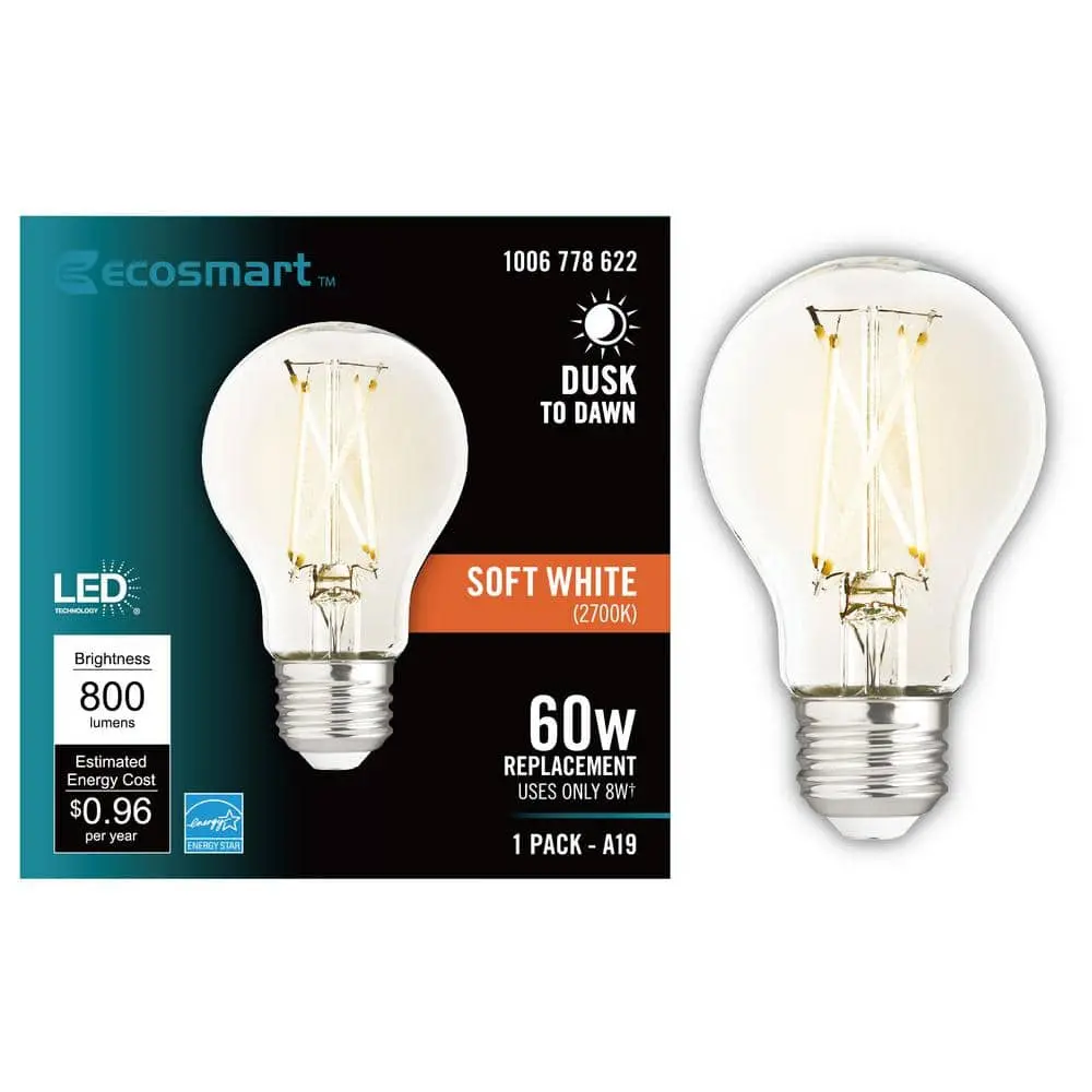 Transform any fixture into a dusk-to-dawn light with the EcoSmart A19 LED bulb, equipped with a built-in light sensor. This sensor automatically turns the bulb on at dusk and off at dawn. Ideal for outdoor spaces like entryways, porches, and backyards, where you need automatic lighting. The A19 LED bulb mimics the traditional incandescent look, featuring an A-line shape and medium (E26) base. Consuming only 8 watts of energy, it emits 800 lumens, offering the same brightness as a 60-watt incandescent bulb. The soft white (2700K) color creates a warm, welcoming glow.