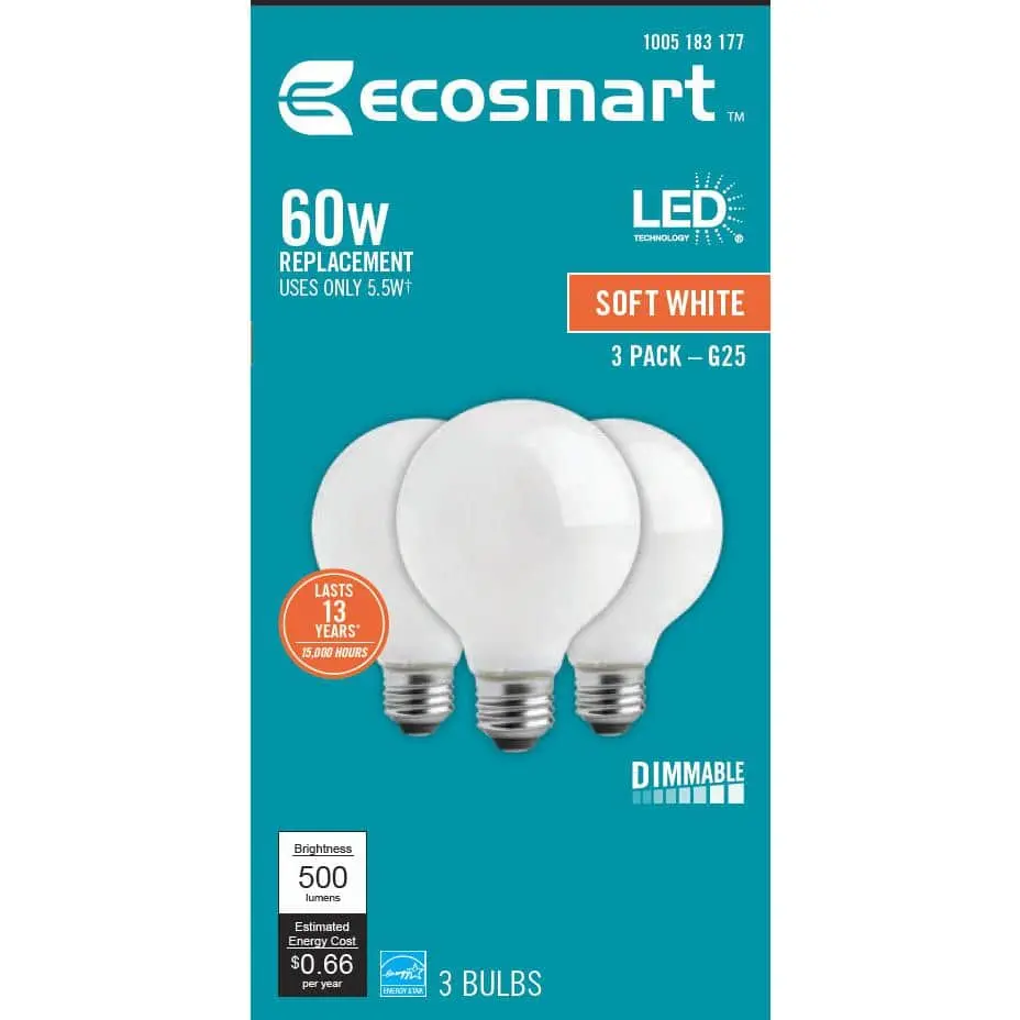 The EcoSmart 60-Watt Equivalent G25 filament LED light bulb offers a stylish and energy-efficient replacement for traditional incandescent bulbs. Featuring a frosted all-glass exterior, this dimmable bulb provides omni-directional (360°) light distribution. With just 5.5 watts of energy use, it offers an impressive 91% energy savings over standard lighting, helping lower your electricity bill. The soft white 2700K color temperature creates a relaxing, balanced atmosphere ideal for living rooms, kitchens, bathrooms, and bedrooms. With a long 15,000-hour lifespa, this LED bulb is perfect for both home and office use. Enjoy energy savings without sacrificing style with EcoSmart.