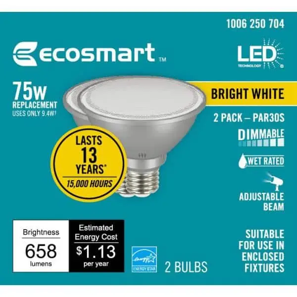 Enhance your lighting with the EcoSmart 75-Watt equivalent PAR30S Dimmable Adjustable Beam Angle LED Light Bulb. These bulbs feature an integrated switch that lets you select the beam angle (Spot, Flood, or Wide Flood) before installation. Choose from 20° (spot), 40° (flood), or 60° (wide flood) to suit your needs. With an energy-efficient 9.5-Watt consumption, it delivers 650 Lumens of bright white (3000K) light, providing the same brightness as a 75-Watt incandescent bulb. These bulbs last for 15,000 hours and cost only $1.14 per year to operate. The bright white light is perfect for creating an energized atmosphere in spaces like kitchens, bathrooms, offices, and bedrooms. Adjust the brightness with dimming capability to create the ideal ambiance. Suitable for both indoor and outdoor use, these bulbs are perfect for recessed, track, and security lighting. Save energy and add style with EcoSmart.