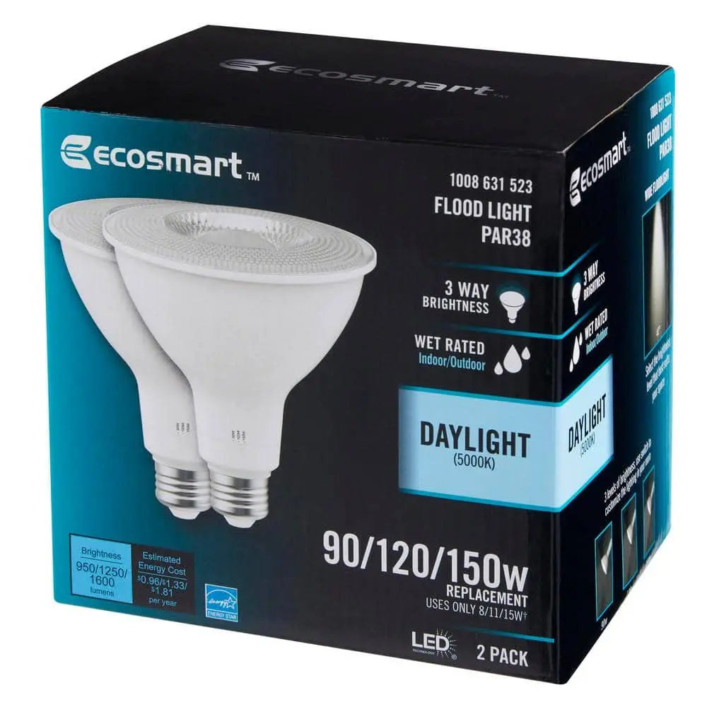 The EcoSmart PAR38 3-Way LED light bulb, offering 90/120/150-Watt equivalents, provides an excellent energy-efficient replacement for traditional incandescent bulbs. These dimmable bulbs are ENERGY STAR certified, helping you save on your energy bill each month. Using only 8/11/15 watts of energy, they offer up to 90% energy savings compared to conventional lighting. With a 5000K Daylight color temperature, they create an energizing and balanced atmosphere in any space, making them ideal for living rooms, kitchens, bathrooms, and bedrooms. These EcoSmart LEDs are suitable for both indoor and outdoor use (wet rated), with a high 90 CRI for superior color accuracy. With a 25,000-hour lifespan, these bulbs are perfect for long-lasting and efficient lighting. Start saving today with EcoSmart.